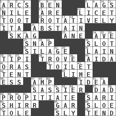 ACROSS 1. Arches 5. Benjamin's nick name 8. Falls behind 12. "Death on the ____" 13. "We ___ not amused" (Victoria) 14. It is permitted: Lat. 15. A blast of a horn 16. Rotating or pertaining to rotation 19. Call ___ day 20. Choose not to consume 21. Heroin 23. One (Scot) 24. "___ Maria" 27. Fastener 30. Position in a hierarchy or organization 31. Fodder prepared in a silo 34. (Had) reclined 35. Native american tent (variation) 38. Collection of objects 40. Opera by Verdi 41. Mouths or openings 42. Rest room 44. Portable shelter 45. Welles in "The Third Man" 46. Curvy letter 47. Electrical Unit 50. The content of cognition 53. More disrespectful 57. Male parent 59. Appease 63. Indian skirt 64. Bake eggs in their shells 65. Slender fish 66. A type of plum 67. Lacquered or enameled metalware 68. Secret 69. Look after DOWN 1. Against 2. Disturbances 3. Covering 4. Put into a specified state 5. Sharp remark 6. Greek god of love 7. Remaining after all deductions 8. 54 in ancient Rome 9. Adept person 10. Set 11. Filthy place 14. Actor's bit 17. American Automobile Association (abbr.) 18. Shallow baking pan 20. Hindu god of fire 22. Aid 24. Jai _ 25. Nothingness 26. Inactive volcano in Sicily 28. Keyboard modifier key 29. Component 30. Scheduled 32. Thick or sticky substance 33. Morally bad or wrong 35. Haul 36. Angers 37. Baking dishes 39. Connecticut Ivy Leaguer 43. Independent ruler or chieftain 47. SW Saudi Arabia district 48. Floor covering 49. Air pressure measure (abbr.) 51. Peak District village in England 52. Composer Copland 54. Droops 55. Slanted text style (abbr.) 56. Suggestive of the supernatural 58. Passed on 59. Pacific Standard Time (abbr.) 60. 17th letter of the Greek alphabet 61. Lubricate 62. Before (prefix) 63. Fast jet (abbr.)