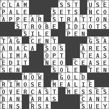 ACROSS 1. Burrowing marine mollusk 5. Fast jet (abbr.) 8. Purpose 11. Diluted with white 12. Arranges properly for use 13. Non-commissioned officer (abbr.) 14. Seem 17. Ski resort town in Vermont 19. Disco prop 21. Foolish or stupid persons 22. Filth; sediment 23. Fenced enclosure 24. Label 27. Penny 29. Girls' org. (abbr.) 32. Phillipine bananalike plant 34. Mayday 36. Ancient Greek god of war 37. Pale green bean 38. Choose 39. Afternoon social gatherings 40. Prepare for publication 41. Modern: prefix 42. Stop 43. Elected rep. 44. Flatfish 46. "___ Little Indians" 47. Immediately 50. Precious metal 52. Full of chinks, cracks, or crevices 55. Ear of corn 57. Cloudy 59. Makes clutter 62. Bar 63. Ancient river in northeast Turkey 64. Patter 65. Followers of ems 66. Acura sports coupe 67. Chop _ DOWN 1. Accounting whiz (abbr.) 2. Infant locale 3. High mountains 4. Confronts 5. Put into a specified state 6. Remove all contents or possession from 7. Sadhe (variant) 8. To (old English) 9. Native of Scotland 10. Immeasurably long periods of time 12. Compass dir. 15. N. Chile seaport 16. Hero or heavy, e.g. 18. Shallow baking pan 20. Gillaume's butler role 24. Stories 25. Tolerate 26. Street urchin 28. Drinks excessively 29. Relatively large 30. Gospel singer Marvin 31. NE Netherlands city 33. Domesticated feline 35. Moe Howard, for one 36. Had dinner 42. Cell (Danish) 45. Rich soil 47. Or not 48. Motion picture award 49. Erodes 51. Flat circles 52. Loose flowing garment 53. "Terrible" tsar 54. Not women's 55. Mountains (abbr.) 56. He sold his birthright 58. Saxophone 60. Compass dir. 61. Filthy place