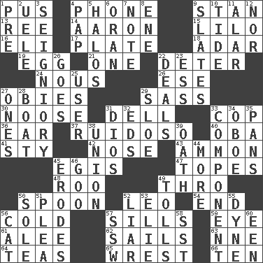 ACROSS 1. Tenth month of the Hindu calendar 4. Give a jingle 9. Comedian Laurel of Laurel & Hardy 13. To riddle 14. Composer Copland 15. _ and Stitch 16. Biblical high priest 17. Food holder 18. The sixth month of the Jewish calendar 19. Ovum 21. Single 22. Prevent from occurring 24. Common sense 26. Compass dir. 27. Off-Broadway awards 29. Backtalk 30. Trap for birds or small mammals 31. Small valley 33. Police officer (slang) 36. Ewer handle 37. Boisterous (Brazilian Portuguese) 40. Chief or king in Benin or Nigeria 41. Filthy place 42. Olfactory organ 43. ID or VA city 45. The front part of a cuirass 47. Drinks excessively 48. Friend of Pooh 49. Through, poetically 50. Soup utensil 52. Lion 54. Conclusion 56. Chilled 57. Beverly of Met fame 59. Sight organ 61. Toward shelter 62. Moves on water 63. Compass dir. 64. Afternoon social gatherings 65. Take or capture by force 66. Nine, plus one DOWN 1. Before (prefix) 2. Ubangi River tributary 3. Signiory (variant) 4. Infant food 5. Rings 6. Northwest Algerian city 7. Musical sound 8. Compass dir. 9. Chalkboards 10. Periodic rise and fall of the sea level 11. Having or resembling wings 12. And not 20. Moves 22. Allots cards 23. Curvy letter 25. One who uses or employs something 27. Singles 28. Water vessel 29. _ gin 31. "Vaya con ____" 32. Begley and Asner 33. Part 34. Mitch Miller's instrument 35. Zero-star reviews 38. The state of being joined or united 39. Pledge 44. Greater amount 45. Eats (away) 46. Thick or sticky substance 49. For Whom the Bell _____ 50. Not divided or shared with others 51. Entreaty 52. One who doesn't tell the truth 53. Writer Wiesel 55. Centimeter-gram-second unit of force 56. Feline 57. Compass dir. 58. Fast jet (abbr.) 60. Car or cant ending
