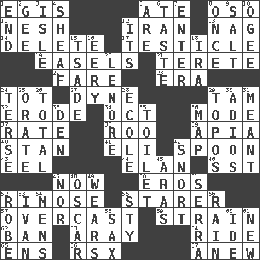 ACROSS 1. The front part of a cuirass 5. Had dinner 8. Bear (Spanish) 11. Soft 12. SW Asia republic 13. Tired old horse 14. Erase 17. One of the two male reproductive glands 19. Artist's stands 21. Cylindrical with tapered ends 22. Conductor's collection 23. Period 24. Small child 27. Centimeter-gram-second unit of force 29. Scottish cap 32. Wear away 34. Sep. follower 36. Method 37. Assign a rank or rating to 38. Friend of Pooh 39. Capital of Western Samoa 40. Comedian Laurel of Laurel & Hardy 41. Biblical high priest 42. Soup utensil 43. Snakelike fish 44. Liveliness 46. Fast jet (abbr.) 47. At this time 50. Greek god of love 52. Full of chinks, cracks, or crevices 55. A viewer who gazes fixedly 57. Cloudy 59. Put through a sieve 62. Forbid 63. Like ___ of sunshine 64. Travel on an animal 65. Followers of ems 66. Acura sports coupe 67. Afresh DOWN 1. Conclude 2. Turn to the right 3. Small island 4. Bundle of cut stalks of grain 5. "We ___ not amused" (Victoria) 6. Clothes sense 7. Keyboard key 8. At one time in the past 9. Table seasoning 10. Double curve, resembling the letter S 12. ___ a Wonderful Life 15. Sadhe (variant) 16. Suggestive of the supernatural 18. Retirement account (abbr.) 20. Poe poem 24. Laconic 25. Speak pompously 26. Add up to 28. Learning spot: Fr. 29. Traditional theme or motif 30. Goodbye (Sp.) 31. Intended 33. Lair 35. Rest room 36. Atlas unit 42. Derisive sound 45. Caspian sea tributary 47. Or not 48. Motion picture award 49. Erodes 51. Father Junipero _ 52. Loose flowing garment 53. "Terrible" tsar 54. Not women's 55. Filthy place 56. Precipitation 58. Saxophone 60. Binary compound 61. ___ Haven, CT