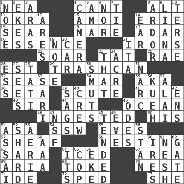 ACROSS 1. Teachers' org. 4. Patter 8. The first octave above the treble staff 11. Gumbo ingredient 13. Mine, in Marseilles 14. 4th largest of the Great Lakes 15. Shrivel 16. Female horse 17. The sixth month of the Jewish calendar 18. Substance 21. Removes the wrinkles 22. Fly high 23. Make lace 25. Actress Charlotte 26. Eastern Standard Time (abbr.) 29. File 13 32. Gospel singer Marvin 34. Impair 35. Alias (abbr.) 38. Bristle 39. Turtle shell scale 41. Court order 43. Title for a knight 44. Tate display 45. Sea 46. Consumed 50. Part of HMS, perhaps 51. White ___ sheet 54. Compass dir. 55. Nights before holidays 57. Archer's quiver 59. Inhabiting a nest 63. "Two Mules for Sister ____" 64. On the rocks 67. Type of rug 68. Roberta Peters solo 69. Puff or smoke 70. A home for chicks 71. Binary compound 72. Moved rapidly 73. A female animal or person DOWN 1. Olfactory organ 2. Makes supply last 3. Caspian sea tributary 4. Device for capturing images 5. Wet nurse (var.) 6. Not either 7. Neckwear 8. Zeal 9. Woody, climbing, usually tropical plant 10. Laconic 12. Ancient Greek god of war 14. Hearing organ 19. Make mention of 20. Auto 21. Call ___ day 23. Not this but _ 24. 43,560 square feet 26. Double-curved letter 27. Perceives with the eye 28. Jacques of French films 30. Obscenities 31. Drug cop 33. Indian skirt 36. Malaysian steamed pastry 37. Jai _ 39. Settles 40. Ship's personnel 42. Followers of ems 45. Lyric poems 47. Science/research agcy. 48. Watched over 49. First lady 51. Slender Brazilian palm 52. Pottery fragment 53. Nest on high 56. Comedian Laurel of Laurel & Hardy 58. Auto club (abbr.) 60. Angers 61. Tender 62. Yard entry 64. It is 65. Police officer (slang) 66. Supplement with great effort