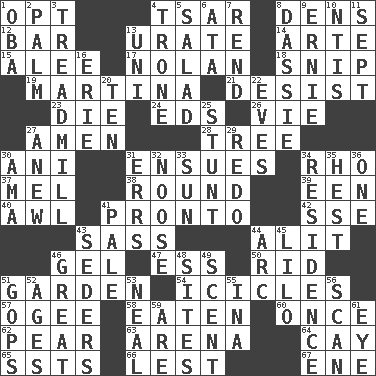 ACROSS 1. Elect 4. Russian ruler of old 8. Habitations of wild animals 12. Tavern 13. A salt of uric acid 14. Johnson of "Laugh-In" 15. Toward shelter 17. Pitcher Ryan 18. Clip 19. Chrissie's court nemesis 21. Cease 23. Expire 24. Begley and Asner 26. Compete 27. So be it 28. Woody plant 30. Black tropical American cuckoo 31. Takes place subsequently 34. 17th letter of the Greek alphabet 37. Cartoonist voice _ Blanc 38. One shot 39. Car or cant ending 40. Leather borer 41. Right away 42. Compass dir. 43. Backtalk 44. Came down and settled, as after flight 46. Set 47. Curvy letter 50. To free from 51. Place where plants grow 54. Winter's stalactites 57. Double curve, resembling the letter S 58. Ingested 60. Single time 62. Lightbulb-shaped fruit 63. Sports stadium 64. Island 65. Fast planes 66. For fear that 67. Compass dir. DOWN 1. Chief or king in Benin or Nigeria 2. Inside of hand 3. Excercise machine 4. Heavy duty weighing machine 5. First course 6. "One Day ___ Time" 7. Tear apart 8. Small ungulate mammals of Africa 9. Bert's buddy 10. Nuclear Threat Initiatives 11. Back-to-school mo. 13. Corn or form start 16. 4th largest of the Great Lakes 20. Nine, plus one 22. Nights before holidays 25. Check the growth or development of 27. Afresh 29. Do over again 30. Nanny (var.) 31. Blunders 32. Trap for birds or small mammals 33. Player for Phoenix 34. Home 35. Command 36. Single 41. Light colored 43. Spring feasts 44. Curve 45. _ and Stitch 46. Relatively large 48. Locates 49. Odor 51. Republicans 52. Eons 53. Anneal 55. _ tizzy (2 wds.) 56. Glance over 59. "We ___ not amused" (Victoria) 61. Sight organ