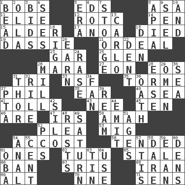 ACROSS 1. Moves up and down 5. Begley and Asner 8. White ___ sheet 11. Writer Wiesel 12. College mil. group 14. Fenced enclosure 15. Tree or shrub in the Birch family 17. Small Philippine buffalo 18. Passed on 19. Hyrax 21. Severe or trying experience 23. Slender fish 25. Small, secluded valley 26. Hindu Mythology: god of death 27. A really long time 28. Greek goddess of the dawn 31. Three (prefix) 33. Overdraft (abbr.) 35. Singer Mel 37. Silvers or Donahue 38. Ewer handle 40. Toward the sea 41. For Whom the Bell _____ 43. Born 45. "___ Little Indians" 46. "We ___ not amused" (Victoria) 47. Big collection agency 50. Nursemaid 52. Entreaty 53. Russian fighter aircraft 54. Buttonhole 56. Watched over 61. Singles 62. Ballerina skirt 65. Showing deterioration from age 66. Bar 67. Indian titles of respect 68. SW Asia republic 69. Keyboard modifier key 70. Compass dir. 71. Elected reps. DOWN 1. Necklace unit 2. Water jar 3. Auction offers 4. Observes 5. Period 6. Spanish title 7. Moe Howard, for one 8. Capital of Western Samoa 9. Sew up the eyelids of hawks and falcons 10. Also 13. Monte _, Las Vegas Hotel/Casino 16. Port city in Latvia 18. Lair 20. Merit 22. Incision 24. To erase 26. Place where flour is made 28. Celtic language 29. Sign of things to come 30. Ocean 31. Son of Odin 32. Cause heat under the collar 34. Avid follower 36. Pledge 37. Parent Teacher Association (abbr.) 39. 480, 500 or 516 sheets of paper 42. Grain storage tower 44. Give off 48. Musical pauses 49. Titan orbits this 51. Ripens 52. Personal Computers (abbr.) 54. Of or related to the anus 55. Penny 57. Nuclear Threat Initiatives 58. Have the gumption 59. Flair 60. Habitations of wild animals 61. Chief or king in Benin or Nigeria 63. Shallow baking pan 64. Purpose