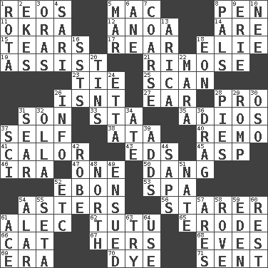 ACROSS 1. Vintage cars 5. Big _ 8. Animal enclosure 11. Gumbo ingredient 12. Small Philippine buffalo 14. "We ___ not amused" (Victoria) 15. Lacerates 17. Bring up, as a child 18. Writer Wiesel 19. Help 21. Full of chinks, cracks, or crevices 23. Neckwear 25. Examine hastily 26. Is not 27. Ewer handle 28. Adept person 31. Manchild 33. R.R. building 35. Goodbye (Sp.) 37. Itself 38. _ moment's notice (2 wds.) 40. San ____ (Riviera town) 41. Bodily heat indicating an inflammation 43. Begley and Asner 45. Viper 46. Lyricist Gershwin 47. Single 50. Mild oath, euphamism for damn 52. Inky black, to poets 53. Health resort 54. Michaelmas daisies 56. A viewer who gazes fixedly 61. Actor Baldwin 62. Ballerina skirt 65. Wear away 66. Domesticated feline 67. Possessive pronoun 68. Nights before holidays 69. Period 70. Color 71. Transmitted DOWN 1. Round or rotation of duties 2. Supplements with great effort 3. Mouths or openings 4. Indian skirt 5. Make imperfect 6. A saturated hydrocarbon 7. Unrefined 8. Friends 9. One of the Great Lakes 10. Born 13. N. Chile seaport 16. Fast planes 18. Period of immesurable duration 20. Canisters 22. Hindu Mythology: god of death 24. Singer James 26. A message received and understood 28. Sliced desserts 29. Frolic 30. Bear (Spanish) 31. Shrivel 32. Water jar 34. Had dinner 36. To trail on the ground 37. _-fi 39. Does sums 42. Loose flowing garment 44. Plant excrements 48. Compass direction 49. Followed as a consequence or result 51. Nathan's nickname 52. And so on (abbr.) 54. Having or resembling wings 55. Stalk of a moss capsule 57. Ancient Greek god of war 58. Be footloose 59. Genesis locale 60. Take ten 61. Adept person 63. Attempt to accomplish something 64. Purpose