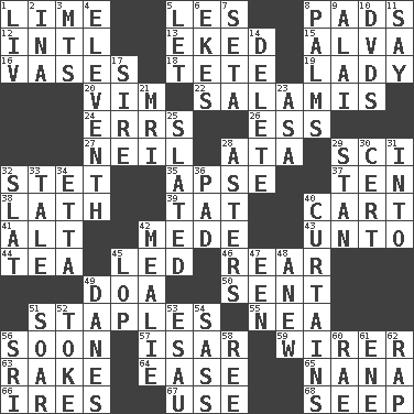 ACROSS 1. Welles in "The Third Man" 5. French article 8. Writing tablets 12. International (abbr.) 13. Supplemented with great effort 15. Inventor's middle name 16. Flower holders 18. Wig 19. Kenny Rogers chart-topper in '80 20. Zeal 22. Deli grouping 24. Blunders 26. Double-curved letter 27. Famous astronaut Armstrong 28. _ moment's notice (2 wds.) 29. _-fi 32. Proofreading order 35. Domed church section 37. Nine, plus one 38. Thin strip of wood or metal 39. Make lace 40. Draw slowly or heavily 41. The first octave above the treble staff 42. Ancient Persian 43. To (old English) 44. Beverage made from leaves 45. Directed 46. Located in or toward the back 49. ___ good deed 50. Posted 51. Paper fasteners 55. Teachers' org. 56. Within a short period 57. Austrian river, tributary to the Danube 59. One who wires 63. Immoral or dissolute person 64. Relaxation 65. Grandmother 66. Angers 67. Purpose 68. Ooze DOWN 1. 54 in ancient Rome 2. _ tizzy (2 wds.) 3. Mountains (abbr.) 4. Veterans Day date 5. Allow 6. Makes supply last 7. Bristle 8. Insides of hands 9. Jai _ 10. Movie discs 11. Declare 14. Erase 17. Title for a man of rank and authority 21. Medical imaging device (abbr.) 23. White ___ sheet 25. Scheduled 28. Michaelmas daisies 29. Comedian Laurel of Laurel & Hardy 30. Sure thing 31. To the inside or interior of 32. Narrow board 33. Lie 34. Singer James 36. Writing tablet 40. Window treatments 42. Ear of corn 45. Chop off 47. Car or cant ending 48. Afresh 49. Natives or inhabitants of Denmark 51. Fly high 52. Puff or smoke 53. He sold his birthright 54. Backtalk 56. Indian title of respect (Mr.) 58. To riddle 60. Actress Charlotte 61. Compass dir. 62. Hit sharply and swiftly
