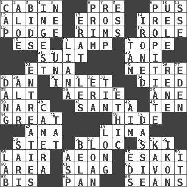 ACROSS 1. Small house or cottage 6. Before (prefix) 9. Festering 12. Place in a line 13. Greek god of love 14. Angers 15. Plash 16. Basketball hoops 17. Hero or heavy, e.g. 18. Compass dir. 19. Desk light 20. Drink excessively 21. Costume for a special activity 23. Cuckoo 24. Inactive volcano in Sicily 25. Distance measurement (Brit.) 28. Daniel's nick name 30. An arm off of a larger body of water 34. Passed on 35. Keyboard modifier key 36. Nest on high 38. A saturated hydrocarbon 39. Drug cop 41. Before Barbara or Clara 43. Nine, plus one 44. Relatively large 46. Flintstone garb 48. Wet nurse (var.) 49. Pale green bean 50. Proofreading order 51. Coalition 53. What Jean-Claude Killy likes to do 56. Den 57. Period of immesurable duration 58. 1973 Nobel Price Winner (Physics) Leo 60. Type of rug 61. Volcanic refuse 62. A piece of turf (Scot.) 63. Altar cloth linen 64. Baking dish 65. Actors Connery and Penn DOWN 1. Head covering 2. Medicinal plant 3. Auction offers 4. Swallow 5. Born 6. Demure 7. Frolic 8. Curvy letter 9. Conciliate 10. Ubangi River tributary 11. Compass dir. 13. Part of Q.E.F. 14. Pressed 19. Climbing, woody, usually tropical vines 20. Scottish cap 22. Single; one (prefix) 24. Pleas 26. French philosopher Descartes 27. Locale of original sin 28. Mild oath, euphamism for damn 29. Having or resembling wings 31. French article 32. Period 33. Metal container 37. Moral principle 40. Device for capturing images 42. Direct toward a target or goal 45. Make lace 47. Hyrax 49. Protracted 50. Indian skirt 51. Actor Lugosi 52. Grant temporary use of 54. Polynesian shrub of the pepper family 55. Image 56. Experiment locale 57. Viper 58. Begley and Asner 59. ___ a Wonderful Life