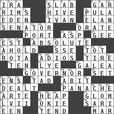 ACROSS 1. Lyricist Gershwin 4. Broad, flat, thick piece 8. Slender fish 11. Basketball hoops 13. Hub of activity 14. Monetary unit of Botswana 15. Locale of original sin 16. _ the terrible 17. Liveliness 18. Elected representative 21. Speak pompously 22. Left side of a ship or aircraft 23. Viper 25. Unit of force equal to gravity 26. Eastern Standard Time (abbr.) 29. Utter; complete 32. Hold, grip (Informal) 34. Compass dir. 35. Small child 38. Roll call or roster of names 39. Goodbye (Sp.) 41. Become fatigued 43. "___ Little Indians" 44. Sodium hydroxide 45. An organ shaped like a helmet 46. Head of state? 50. Put into a specified state 51. Followers of ems 54. Small boy 55. "This won't hurt ____!" 57. Started a card game 59. Flamboyance 63. Johnson of "Laugh-In" 64. Pile 67. Seize upon or latch onto something 68. 57 in ancient Rome 69. Migrant worker of the '30s 70. Indian skirt 71. Car or cant ending 72. Be inclined (to) 73. Make imperfect DOWN 1. Angers 2. Travel on an animal 3. So be it 4. Upper-body garments 5. 54 in ancient Rome 6. Actress Gardner 7. Benjamin's nick name 8. Russian prison camp 9. Having winglike extensions 10. The wife of a rajah (variant) 12. Fastener 14. For each 19. Frog relative 20. Globe 21. Elect 23. In addition 24. Takes to court 26. Hearing organ 27. Opportunity 28. Carry 30. Flexible twig of a willow tree 31. Singer James 33. Austrian-born American filmmaker Fritz 36. Lubricates 37. Relationship diagram 39. Inventor's middle name 40. Colored 42. Erode 45. Broad smile 47. Baseball player Mel 48. Slept 49. Chief or king in Benin or Nigeria 51. Peak District village in England 52. Impudent aggressiveness 53. Smooth fabric 56. Labels 58. Luau accessory 60. Burrowing marine mollusk 61. Israeli folk dance 62. Independent ruler or chieftain 64. Being at a high temperature 65. Make supply last 66. The 18th letter of the Arabic alphabet