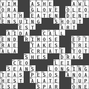ACROSS 1. Zeal 4. American tennis player Robert 8. Leather borer 11. Mouth or opening 12. Michael Jackson trademark 14. Margarine 15. Thin strip of wood or metal 17. Ingested 18. Gouge 19. Following as a consequence or result 21. Yell 23. Eastern Standard Time (abbr.) 24. Tate display 25. Opera by Verdi 27. Give a ring to 30. Conclusion 31. Full of chinks, cracks, or crevices 34. Lizard (obsolete) 37. Actress Charlotte 38. Receives possession of 39. Three (prefix) 40. Insect wing 41. Make 43. Small child 44. "______ My Girl" (Turtles hit) 45. To draw with force 47. Corporate head (abbr.) 49. Flowery wreath 50. Seines 52. Yearning 56. Afternoon social gatherings 57. Mexican monetary units 60. Small Philippine buffalo 61. Command 62. Having winglike extensions 63. Uncastrated adult male sheep 64. Compass dir. 65. Coast Guard woman 66. Single DOWN 1. Grand slam 2. SW Asia republic 3. Floor protectors 4. Rep 5. Volcanic refuse 6. Being at a high temperature 7. Night before a holiday 8. Native American of Southwest Alaska 9. Left 10. Car dealer's back yard 13. Followers of ems 14. Scent 16. Took on color 20. Austrian river, tributary to the Danube 22. Actor Linden 25. Of or related to the anus 26. The content of cognition 27. Popular sodas 28. At sea 29. For fear that 30. Epoch 32. Hankering 33. Female horse 34. Singer James 35. Toadlike animal 36. Teat (slang) 42. Locale of original sin 44. Boy, to dad 46. Capital of Latvia 47. Stop 48. Compass direction 49. Failure 50. Observes 51. Health resort 52. Globular water bottle used in Asia 53. To the inside or interior of 54. Part of speech 55. Stare wonderingly 56. Definite Article 58. Raised railways 59. Plant excrement