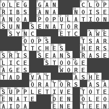 ACROSS 1. Cassini of fashion 5. Separate the seeds from cotton 8. Hoof sound 12. Teases 13. Santa ___, CA 14. Annoying sound 15. Small Philippine buffalo 16. Census information 19. Player for Phoenix 20. Legislator 21. Synchronize (abbr.) 23. And so on (abbr.) 24. Deep reverence 27. I made a mistake 30. Russian ruler of old 31. Skin irritations 34. Possessive pronoun 35. Indian titles of respect 38. Seines 40. To erase 41. Louse (plural) 42. Moe Howard, for one 44. Ripens 45. Had on 46. Small boy 47. Large container 50. American tennis player Robert 53. Speakers 57. White ___ sheet 59. Supplementary 63. Carryall 64. Maternal 65. Lair 66. Butter sub 67. Opera by Verdi 68. Compass dir. 69. Adolescent DOWN 1. Mouths or openings 2. "_ and Lucy" (Charlie Brown theme song) 3. Dark wood 4. Girls' org. (abbr.) 5. Yawn 6. At once, immediately (arch.) 7. California wine valley 8. Small bed 9. Cards in a Roman deck? 10. Bear (Spanish) 11. Writing instrument 14. Drug cop 17. Shoshoni 18. Car dealer's back yard 20. Native of Scotland 22. Annoying sounds 24. Toward the sea 25. Armed conflicts 26. Celtic language 28. Personal Computers (abbr.) 29. "______ My Girl" (Turtles hit) 30. Triplets 32. Ingest 33. Overwhelm 35. Narrow board 36. Capital of Latvia 37. On the rocks 39. "Barney Miller" actor Jack 43. Pate de foie ____ 47. Short-tailed, large-bodied rat 48. "We ___ not amused" (Victoria) 49. Make lace 51. White Person, in Hawaii 52. First name in cosmetics 54. Periodic rise and fall of the sea level 55. Baking chamber 56. French philosopher Descartes 58. Period of immesurable duration 59. Ocean 60. University (slang) 61. Groovy apt. 62. Parent Teacher Association (abbr.) 63. Small child