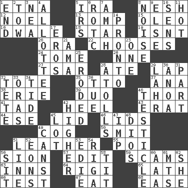 ACROSS 1. Inactive volcano in Sicily 5. Lyricist Gershwin 8. Delicate 12. Christmas carol 13. Frolic 15. Butter sub 16. A sleeping potion; an opiate (poet.) 18. Play the lead 19. Is not 20. Mouth or opening 22. Elects 24. Heavy book 26. Compass dir. 27. Russian ruler of old 28. Had dinner 29. Pet locale 32. Haul 35. "Beetle Bailey" pooch 37. Santa ___, CA 38. 4th largest of the Great Lakes 39. Superhero pair 40. Son of Odin 41. Small amount or degree 42. Person who is morally reprehensible 43. Part of Q.E.F. 44. Compass dir. 45. Hat (slang) 46. Hats (slang) 49. Gear tooth 50. Stricken, poetically 51. Cordwainer's material 55. Luau course 56. The Jewish people; Israel 57. Prepare for publication 59. Fraudulent business schemes 63. Lodging establishments 64. Swiss mountan, "Queen of the Mountains" 65. Thin strip of wood or metal 66. Trial 67. Consume 68. Relaxation DOWN 1. Conclusion 2. Pull behind 3. Teachers' org. 4. One to whom something is allotted 5. Big collection agency 6. College mil. group 7. Nursemaid 8. Annoying sound 9. Otherwise 10. Elected reps. 11. Being at a high temperature 14. Right away 17. Greek god of love 21. Nursemaid (var.) 23. Single 25. Eaten away 28. Ringlike coral islands and reefs 29. Cowardly lion portrayer 30. Small Philippine buffalo 31. Piece 32. Wig 33. Mouths or openings 34. Event that recurs at intervals 36. Third day of the wk. 40. A testis 42. Having greater elevation 45. Car dealer's back yard 47. Mischievous child 48. "Vaya con ____" 49. 2nd pers. sing. pres. of can (arch.) 51. Actor's bit 52. Immeasurably long periods of time 53. Singer Brickell 54. Port city in Latvia 56. Be seated 58. Teat (slang) 60. American Automobile Association (abbr.) 61. Mountains (abbr.) 62. A female animal or person
