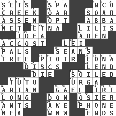 ACROSS 1. Puts into a specified state 5. Health resort 8. Non-commissioned officer (abbr.) 11. Small stream 13. Boat paddle 14. Fly high 15. NE Netherlands city 16. Choose 17. Swedish rock group 18. Fish or hair follower 19. Inactive volcano in Sicily 21. Ms. Damita and namesakes 22. The content of cognition 24. An important port of Yemen 25. Buttonhole 27. Luau accessory 29. Friends 30. Actors Connery and Penn 32. Family _ (genealogy) 33. Peter (Polish) 35. Pulitzer Prize-winning author Ferber 39. Flat circles 41. Grant temporary use of 42. Expire 43. Dirtied 45. Ballerina skirt 48. Capital and largest city of Mongolia 49. Believer in; advocate of (suffix) 50. Highlander 52. Three (prefix) 55. Having great length 56. Spanish title 57. Flexible twig of a willow tree 59. Pismires 60. Deep reverence 61. Give a jingle 62. Teachers' org. 63. Compass dir. 64. Extremities DOWN 1. Glance over 2. Celtic language 3. A testis 4. Perceive with the eye 5. Within a short period 6. Dad 7. Nonscientific branch of learning 8. Impressive in appearance 9. Apartment or room in a ship 10. Mouths or openings 12. Leg joints 14. Expressed in words 20. Make lace 21. (Had) reclined 23. Administered medicine 25. Fitting 26. Auto 27. Allow 28. Ewer handle 30. Mayday 31. Former Milwaukee Brewers owner Bud 33. 23rd letter of the Greek alphabet 34. Frozen water 36. Conveyance 37. Compass dir. 38. Increase 40. Goddess of spring and wife of Bragi 43. Take to court 44. Lowest deck of a ship 45. Heavy duty weighing machine 46. National forest in Provo, Utah 47. Labels 49. Actor Alda or Thicke 50. Woman's formal wear 51. Afresh 53. Tear apart 54. Angers 56. Simpleton 58. A female animal or person