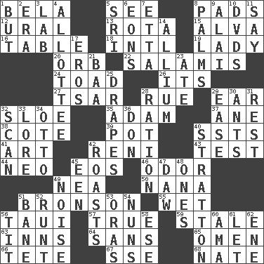 ACROSS 1. Actor Lugosi 5. Perceive with the eye 8. Writing tablets 12. Mountain range 13. Roll call or roster of names 15. Inventor's middle name 16. Eating place 18. International (abbr.) 19. Kenny Rogers chart-topper in '80 20. Globe 22. Deli grouping 24. Frog relative 26. It is 27. Russian ruler of old 28. Sorrow 29. Hearing organ 32. _ gin 35. First man 37. A saturated hydrocarbon 38. ____ d'Azur (French Riviera) 39. Cooking vessel 40. Fast planes 41. Tate display 42. Painter Guido (1575-1642) 43. Trial 44. Modern: prefix 45. Greek goddess of the dawn 46. Scent 49. Teachers' org. 50. Nanny 51. "Death Wish" actor 55. Soggy 56. "Change" in Tahitian 57. Loyal 59. Having lost freshness 63. Taverns 64. Without 65. Sign of things to come 66. Wig 67. Compass dir. 68. Nathan's nickname DOWN 1. On the contrary 2. Period 3. Experiment locale 4. One to whom something is allotted 5. _ Lanka 6. Immeasurably long periods of time 7. Singer James 8. Insides of hands 9. Jai _ 10. Movie discs 11. Declare 14. Plant genus of onion and garlic 17. Greek god of love 21. Sound made by sheep 23. Had dinner 25. Window treatments 28. Food allowance for one day 29. Relaxation 30. Pismires 31. Respite 32. Examine hastily 33. Old wives' tales, e.g. 34. "Beetle Bailey" pooch 36. Spanish title 40. Ski resort town in Vermont 42. Cooks with dry heat, as in an oven 45. Car or cant ending 47. Obsolete 48. Washington bills 49. Annoying sound 51. Object of repulsion 52. The smallest animal of a litter 53. Mouths or openings 54. Religious women 56. Teat (slang) 58. Compass dir. 60. Housemaid (var.) 61. Allow 62. Compass dir.