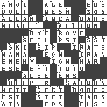 ACROSS 1. Mine, in Marseilles 5. Grow older 8. Begley and Asner 11. Dunce 12. Delicate 14. Mayday 15. Assad's deity 17. South American Indian 18. Have the gumption 19. Ear of corn 21. Plant genus of onion and garlic 23. Color 25. Be footloose 26. Stitch closed the eyes of (a falcon) 27. 23rd letter of the Greek alphabet 28. Fast jet (abbr.) 31. What Jean-Claude Killy likes to do 33. Small drink 35. Feeling or showing extreme anger 37. Nanny 38. Period of immesurable duration 40. SW Asia republic 41. Foe 43. Electrically charged atom 45. Make imperfect 46. Compass dir. 47. Bank Draft (abbr.) 50. Ballerina skirt 52. Toward shelter 53. Followers of ems 54. Aide 56. Titan orbits this 61. Remaining after all deductions 62. Tenth: prefix 65. Cowboy competition 66. Eastern Standard Time (abbr.) 67. Proofreading order 68. Bar bills 69. "One Day ___ Time" 70. Greek goddess of the dawn 71. Otherwise DOWN 1. First man 2. Undercover agent 3. Water jar 4. Slanted text style (abbr.) 5. Black tropical American cuckoo 6. Commissioned mil. rank 7. Fortification 8. He sold his birthright 9. Dormintory (informal) 10. Compass dir. 13. Radiant circles of light 16. Flintstone garb 18. Expire 20. Snake ____ (dice throw) 22. 57 in ancient Rome 24. Writer Wiesel 26. Thailand, formerly 28. "Two Mules for Sister ____" 29. Play the lead 30. Nine, plus one 31. Without 32. Leg joint 34. Luau course 36. Tall New Zealand timber tree 37. Born 39. Musical sound 42. Sharp bark 44. Religious women 48. Eats 49. Cylindrical with tapered ends 51. Russian ruler of old 52. Keyboard modifier key 54. Behest 55. Singer James 57. Lug 58. Freehold land 59. Confederate soldiers (slang) 60. Characteristic smell of wine 61. Teachers' org. 63. Corporate head (abbr.) 64. ___ a Wonderful Life