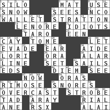 ACROSS 1. Grain storage tower 5. Floor covering 8. Purpose 11. Overwhelm 12. Perceives with the eye 13. Non-commissioned officer (abbr.) 14. Place for singles 17. Ski resort town in Vermont 19. Poe poem 21. Foolish or stupid persons 22. Pacific island yam 23. Car or cant ending 24. Island 27. Heavy book 29. Allow 32. Dodge 34. Ewer handle 36. Helper 37. Australian parrot (variant) 38. Mouth or opening 39. Having or resembling wings 40. Actor's bit 41. Put into a specified state 42. Moves on water 43. Begley and Asner 44. South Vietnam president (1954) 46. Perceive with the eye 47. At this time 50. Mouths or openings 52. Full of chinks, cracks, or crevices 55. Sounds asleep 57. Cloudy 59. Disco prop 62. Bit 63. Like ___ of sunshine 64. Monetary unit of Yemen 65. One (Scot) 66. Acura sports coupe 67. Jai _ DOWN 1. Compass dir. 2. _ tizzy (2 wds.) 3. Hang loosely or laxly 4. A small or young owl 5. Was introduced to 6. Nest on high 7. Sadhe (variant) 8. To (old English) 9. Native of Scotland 10. Immeasurably long periods of time 12. Compass dir. 15. Related on the mother's side 16. "Corrida" creature 18. Shallow baking pan 20. Lover boys 24. Cell (Danish) 25. Prevent from happening 26. Tall tales 28. Having ears or earlike features 29. Ms. Damita and namesakes 30. Peak District village in England 31. Laconic 33. Pass on 35. Food allowance for one day 36. American Automobile Association (abbr.) 42. Don Adams' spy role 45. Greek god of love 47. Or not 48. Motion picture award 49. Puts on (as clothing) 51. Spanish missionary in California 52. Round or rotation of duties 53. "Terrible" tsar 54. Ancient Persian 55. Filthy place 56. Land 58. Saxophone 60. Sound made by sheep 61. Biblical high priest