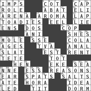 ACROSS 1. Naughty children 5. Small bed 8. Head covering 11. Hero or heavy, e.g. 12. Blind as ____ 14. Biblical high priest 15. Sports stadium 17. Scent 18. Infant locale 19. Sycophants 21. Snakelike fish 22. Whopper 23. Followers of ems 24. Two (Sp.) 25. Police officer (slang) 27. Black tropical American cuckoo 28. "______ My Girl" (Turtles hit) 31. Undercover agent 35. Compass dir. 37. Root beer relative 38. Grows older 39. Federal power corp. 41. Of or related to the anus 42. Narrow board 43. Eastern Standard Time (abbr.) 45. Monthly bill 46. False hair 47. Small child 49. Layer 51. Supplement with great effort 52. Ocean 55. Compass dir. 57. Curvy letter 60. Thinks logically 62. Hearing organ 63. Arguments over trivial matters 65. Table seasonings 66. Had dinner 67. Israeli folk dance 68. The content of cognition 69. Directed 70. Teat (slang) 71. Dormintory (informal) DOWN 1. Feeling or showing extreme anger 2. Person of subnormal intelligence 3. Entreaties 4. Post 5. Auto 6. Mitch Miller's instrument 7. Not wild 8. Portable communications device 9. Jai ____ 10. Corncob 13. Baby powder 16. Opera by Verdi 17. Help 20. Immeasurably long periods of time 26. Motion picture award 29. Flair 30. Table seasoning 31. Vertical spar for supporting sails 32. Stare at amorously 33. Resembling or made to resemble leather 34. First name in cosmetics 36. First lady 40. Michaelmas daisies 44. Puff or smoke 48. Afternoon social gatherings 50. Delicate 52. Twentieth part of a lira 53. Keyboard key 54. Indian state 55. Be tempered by heat 56. Nathan's nickname 58. Specific locale 59. Indian skirt 61. Stated 64. Make lace