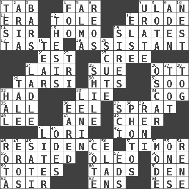 ACROSS 1. Keyboard key 4. Distant 7. ____ Bator 11. Period 12. Lacquered or enameled metalware 13. Wear away 14. Title for a knight 15. Same (prefix) 16. Chalkboards 17. Clothes sense 19. Aide 21. Eastern Standard Time (abbr.) 23. Algonquian 24. Den 25. Institute legal proceedings 26. Baseball player Mel 29. Tarsus (plural) 30. Mountains (abbr.) 31. "Barney Miller" actor Jack 32. Possessed 33. Falsehood 34. Gear tooth 35. Everything 36. Snakelike fish 37. Small fatty European fish 40. Area sheltered from the wind 41. One (Scot) 42. "Mermaids" star 43. Australian parrot (variant) 45. Electrically charged atom 46. Home 51. The easternmost of the Lesser Sundas 55. Spoke pompously 56. Butter sub 58. Single 59. Hauls 60. Small amounts or degrees 61. Lair 62. SW Saudi Arabia district 63. Followers of ems 64. Compass dir. DOWN 1. Trial 2. Roberta Peters solo 3. Drinking establishments 4. Egg _ yung 5. _ mater 6. Vintage cars 7. A salt of uric acid 8. Globular water bottle used in Asia 9. An important port of Yemen 10. Egg locale 12. College paper 13. Otherwise 16. Begets 18. Pull apart 20. Snake scale 22. Three (prefix) 24. Dipping utensil 25. Grin 26. Motion picture award 27. A blast of a horn 28. Coat; cloak 29. Falsehood 32. Actor Linden 33. Soviet premier 1918-24 36. Having ears or earlike features 37. _-fi 38. Pictures 39. Painter Guido (1575-1642) 43. 61 cubic inches 44. Lyric poems 46. Roll call or roster of names 47. Greek god of love 48. Suttee (variant) 49. ____ d'Azur (French Riviera) 50. Flair 52. Method 53. Singles 54. French philosopher Descartes 57. Begley and Asner