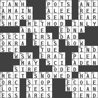 ACROSS 1. Hyperbolic tangent 5. Cooking vessels 9. One (Scot) 12. At full speed 14. Toward shelter 15. To sift 16. Taiwanese island in East China Sea 17. Transmitted 18. Ewer handle 19. A female animal or person 20. Mode 23. Inwardly 24. Competent 25. Pulitzer Prize-winning author Ferber 27. Religious group 30. Big collection agency 32. June honoree 33. Gumbo ingredient 34. Snakelike fish 36. Ribbon knot 38. Perceive with the eye 39. Third day of the wk. 40. Working for oneself (abbr.) 43. Compass dir. 46. Part of Q.E.F. 48. Entreaty 49. Fifth month 51. _-fi 52. An important port of Yemen 53. Beget 54. Wrote a lyric poem 56. Confront 58. Frozen precipiation fell 61. Actor Linden 64. The grampus (Milton) 65. Obstruct or block passage 66. Learning spot: Fr. 68. Car dealer's back yard 69. Trial 70. Pitcher Ryan 71. Curvy letter 72. Ancient Greek god of war 73. Look after DOWN 1. Scottish caps 2. Nanny 3. Nathan's nickname 4. Part of HMS, perhaps 5. Romantic infatuation 6. Butter sub 7. Watched over 8. Put into a specified state 9. Sports stadium 10. Actress Patricia 11. Suggestive of the supernatural 13. Unfeeling 21. Writer Wiesel 22. Cylindrical with tapered ends 23. _ china 24. _ moment's notice (2 wds.) 26. Pat or tap gently 27. Mayday 28. Make supply last 29. Ship's personnel 31. Disparaging remarks 35. Manatee 37. Rampant 41. Born 42. One of the 12 tribes of Israel 44. Stricken, poetically 45. Armed conflict 47. Event that recurs at intervals 48. Groovy apt. 50. Of or pertaining to yesterday 53. Religious groups 55. Paradise 56. Undercover agent 57. Greek god of love 59. Olfactory organ 60. Chooses 61. Hollow 62. Actor Alda or Thicke 63. Grant temporary use of 65. R.R. building 67. Small bed