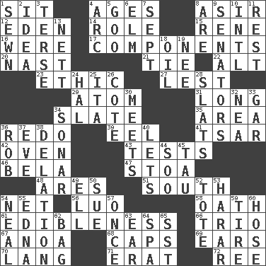 ACROSS 1. Be seated 4. Ripens 8. SW Saudi Arabia district 12. Locale of original sin 14. Hero or heavy, e.g. 15. French philosopher Descartes 16. We are 17. Pieces 20. Political cartoonist Thomas 21. Neckwear 22. The first octave above the treble staff 23. Value system 27. For fear that 29. Tiny particle 31. Yearn 34. Schedule 35. Type of rug 36. Make new 39. Snakelike fish 41. Russian ruler of old 42. Baking chamber 43. Trials 46. Actor Lugosi 47. Portico 48. Ancient Greek god of war 51. 180 degrees 54. Fish or hair follower 56. Nilotic language 58. Pledge 61. The property of being fit to eat 66. Musical group of three 67. Small Philippine buffalo 68. Smile enhancers 69. Hearing organs 70. Long (Scottish) 71. Part of Q.E.F. 72. To sift DOWN 1. Stitched 2. The content of cognition 3. Laconic 4. Curve 5. Thick or sticky substance 6. Shade tree 7. Back-to-school mo. 8. "We ___ not amused" (Victoria) 9. Elected representatives 10. International (abbr.) 11. Respite 13. Remaining after all deductions 18. Petroleum 19. Born 24. Actor Linden 25. Call ___ day 26. ____ d'Azur (French Riviera) 28. Narrow boards 30. Confronts 32. Teachers' org. 33. Slender fish 34. Echolocation 36. Director Reiner 37. First lady 38. Conveyance 40. Allows 44. "Barney Miller" actor Jack 45. The 19th letter of the Greek alphabet 49. Pipe bend 50. Take to court 52. Carry 53. Ethiopian city, capital of Harari 54. Anneal 55. Pulitzer Prize-winning author Ferber 57. Single time 59. Hoop that covers a wheel 60. Stockings 62. Paper or plastic container 63. Ewer handle 64. Health resort 65. Fast jet (abbr.)