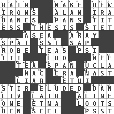ACROSS 1. Water falling in drops from the sky 5. Create 9. Morning condensation 12. Removes the wrinkles 14. Actor Alda or Thicke 15. Lyricist Gershwin 16. Natives or inhabitants of Denmark 17. Baking dishes 18. Teat (slang) 19. Curvy letter 20. College paper 23. Proofreading order 24. Toward the sea 25. Like ___ of sunshine 27. Argument over a trivial matter 30. Fast jet (abbr.) 32. Plant excrement 33. Loose flowing garment 34. Afternoon social gatherings 36. 23rd letter of the Greek alphabet 38. One more than two 39. Nilotic language 40. Born 43. Afternoon social gathering 46. Connect, as a bridge 48. Southern CA. univ. 49. Apple computer (short form) 51. Epoch 52. Political cartoonist Thomas 53. One who doesn't tell the truth 54. Needle holder 56. Commotion 58. Dodged 61. Daniel's nick name 64. 54 in ancient Rome 65. Den 66. Place in a line 68. Single 69. Inactive volcano in Sicily 70. Plunders 71. Benjamin's nick name 72. Sew up the eyelids of hawks and falcons 73. Inconspicuous attention getter DOWN 1. Travel on or in a vehicle 2. Ancient river in northeast Turkey 3. Charged particles 4. Compass dir. 5. Atlas contents 6. Jai ____ 7. Sunflower state 8. Followers of ems 9. Short, simple song 10. One of the Great Lakes 11. Electrical Unit 13. Fast planes 21. Behest 22. Artist's stands 23. Plant excrements 24. Had dinner 26. Reproach for some lapse or misdeed 27. Indian title of respect (Mr.) 28. Luau course 29. "This won't hurt ____!" 31. Grayish beige 35. Flew 37. South American Indian 41. Raised railways 42. Consume 44. Independent ruler or chieftain 45. American Automobile Association (abbr.) 47. Nathan's nickname 48. Corn or form start 50. Make 53. Make or become more lively 55. Hereditary estate 56. Oscar Madison type 57. Prong on a fork 59. Actor's bit 60. Mountain range 61. "Vaya con ____" 62. Pismires 63. Egg locale 65. French article 67. Chop off