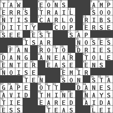 ACROSS 1. The 23rd letter of the Hebrew alphabet 4. Immeasurably long periods of time 8. Electrical Unit 11. Blunders 13. Get behind 15. "Barney Miller" actor Jack 16. Nuclear Threat Initiatives 17. Monte _, Las Vegas Hotel/Casino 18. Teases 19. Simple song 21. Police officer (slang) 22. Celtic language 23. Perceive with the eye 24. Eastern Standard Time (abbr.) 27. Plant excrement 29. Austrian river, tributary to the Danube 30. Olfactory organs 34. Avid follower 36. Printing process, for short 39. Frees from moisture 40. Mild oath, euphamism for damn 41. Approach 43. Lacquered or enameled metalware 44. Keyboard key 46. Relaxation 47. Followers of ems 48. Annoying sound 49. Independent ruler or chieftain 51. Nine, plus one 53. Boy, to dad 54. R.R. building 57. Open wide 60. Baseball player Mel 63. Natives or inhabitants of Denmark 65. Enthusiastic 66. One or ones belonging to thee 69. Negative votes 70. Standoff 71. Having ears or earlike features 72. Opera by Verdi 73. Double-curved letter 74. Beverages made from leaves 75. Luau accessory DOWN 1. Looks after 2. Nick name for Arthur 3. Compose 4. And so on (abbr.) 5. Mouth or opening 6. Drug cop 7. Grain storage tower 8. SW Saudi Arabia district 9. Disorderly crowds 10. Introduce or present, as a question 12. Fast jet (abbr.) 14. Chops off 18. Newsperson 20. Consenting reply 25. "Two Mules for Sister ____" 26. Heavy duty weighing machine 28. Plus 29. Swallowed 31. The Jewish people; Israel 32. Snakelike fish 33. Compass dir. 34. Papal veil 35. Opposed to 37. Beverage made from leaves 38. Fertile tracts in a desert 40. Lair 42. San ____ (Riviera town) 45. Portuguese money of account (variant) 50. Working for oneself (abbr.) 52. Observe 54. Slow-paced one 55. Miss Universe 1986, Barbara Palacios _ 56. Slender Brazilian palm 57. Yard entry 58. Advice 59. Sliced desserts 61. Not this but _ 62. Hoop that covers a wheel 64. Santa ___, CA 67. Teachers' org. 68. Begley and Asner