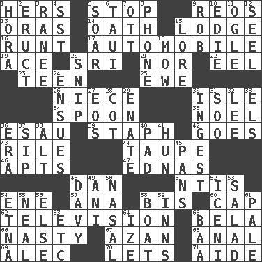 ACROSS 1. Possessive pronoun 5. Close up, plug up 9. Vintage cars 13. Mouths or openings 14. Pledge 15. Inn 16. Undersized animal 17. Form of transportation 19. Adept person 20. _ Lanka 21. Or not 22. Snakelike fish 23. Adolescent 25. She-sheep 26. Sibling's daughter 30. Capri or Wright 34. Soup utensil 35. Christmas carol 36. He sold his birthright 39. Staphylococcus 42. Moves 43. Cause heat under the collar 44. Grayish beige 46. Flats, for short 47. Ferber et al. 48. Daniel's nick name 51. Nuclear Threat Initiatives 54. Compass dir. 57. Santa ___, CA 58. Again 60. Head covering 62. Boob tube 65. Actor Lugosi 66. Offensive 67. Muslim summons to prayer 68. Of or related to the anus 69. Actor Baldwin 70. Allows 71. Helper DOWN 1. Israeli folk dance 2. Spew [out] 3. Indian princess (variant) 4. Fast jet (abbr.) 5. Fly high 6. "Change" in Tahitian 7. Baseball player Mel 8. Give a jingle 9. Director Reiner 10. Singer Brickell 11. Stare 12. Sew up the eyelids of hawks and falcons 15. Old wives' tales, e.g. 18. Cut the grass 20. Clip 24. Follows as a consequence or result 27. Greek goddess of the dawn 28. Small bed 29. Related on the mother's side 30. Eat 31. "Barney Miller" actor Jack 32. Area sheltered from the wind 33. Raised railways 36. Period 37. Small drink 38. The first octave above the treble staff 40. Writing tablet 41. Attila the _ 45. Zero-star reviews 48. American folk hero Crockett 49. Cuckoo 50. Rhinal 52. Ancient Celtic tribe of eastern Britain 53. First course 54. Inactive volcano in Sicily 55. Be tempered by heat 56. Otherwise 58. Water vessel 59. Lodging establishments 61. Diluted with white 63. And so on (abbr.) 64. Ending with capital 65. Sound made by sheep