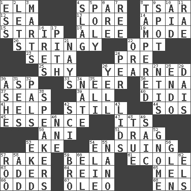 ACROSS 1. Shade tree 4. Coast Guard woman 8. Russian ruler of old 12. Ocean 13. Old wives' tales, e.g. 14. Capital of Western Samoa 15. Remove all contents or possession from 18. Toward shelter 19. Method 20. Slender, wiry 22. Elect 23. Bristle 24. Before (prefix) 25. Like a shrinking violet 26. Had a strong desire 30. Cleo's killer 33. Contemptuous expression 36. Inactive volcano in Sicily 37. Oceans 39. 100% 40. "You Light Up My Life" star Conn 41. Assist 42. Free of sound 44. Distress signal 45. Substance 47. It is 50. Black tropical American cuckoo 51. To draw with force 53. Make supply last 54. Taking place subsequently 57. Immoral or dissolute person 59. Actor Lugosi 61. Learning spot: Fr. 63. River in Europe 64. It's straight from the horse's mouth 65. Cartoonist voice _ Blanc 66. Likelihood 67. Butter sub 68. Followers of ems DOWN 1. Curvy letter 2. Allows 3. Shops 4. Volcanic refuse 5. Many (prefix) 6. "We ___ not amused" (Victoria) 7. To sift 8. ________ with (broke a safety seal) 9. Specific locale 10. Help 11. Actress Charlotte 16. Angers 17. Heart or essence 21. Negative votes 22. Mouth or opening 24. For each 26. Shout 27. Nuclear Threat Initiatives 28. Inside; within (prefix) 29. Raised platform 30. American tennis player Robert 31. Observes 32. Friends 34. Nathan's nickname 35. Connecticut Ivy Leaguer 38. Orators 42. _-fi 43. Hats (slang) 46. Compass dir. 48. Loyal 49. Ketch in the Levant 52. Dwarf 53. Made supply last 54. Writer Wiesel 55. Billionth: prefix 56. Small, secluded valley 57. Friend of Pooh 58. Say or write further 59. Sis' sibling 60. Snakelike fish 62. Raised railways