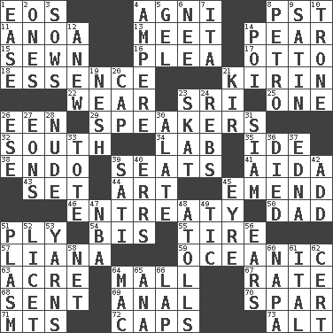 ACROSS 1. Greek goddess of the dawn 4. Hindu god of fire 8. Pacific Standard Time (abbr.) 11. Small Philippine buffalo 13. Rendezvous 14. Lightbulb-shaped fruit 15. Stitched 16. Entreaty 17. "Beetle Bailey" pooch 18. Substance 21. Japanese brewing company 22. Put on (as clothing) 23. Indian title of respect (Mr.) 25. Single 26. Car or cant ending 29. Orators 32. 180 degrees 34. Experiment locale 35. Binary compound 38. Inside; within (prefix) 39. Theater features 41. Opera by Verdi 43. Arrange properly for use 44. Nonscientific branch of learning 45. Make improvements or corrections to 46. Plea 50. June honoree 51. Travel a route regularly 54. Twice 55. Become fatigued 57. Climbing, woody, usually tropical vines 59. Pertaining to the sea 63. Measure of real estate 64. Shopping center 67. Pace 68. Posted 69. Of or related to the anus 70. Practice fight 71. Mountains (abbr.) 72. Balmoral and tarboosh 73. Keyboard modifier key DOWN 1. Relaxation 2. Washington bills 3. Sty mamas 4. Electrical Unit 5. Set 6. Born 7. Call ___ day 8. Stone: prefix 9. Smooth fabric 10. Heavy duty weighing machine 12. Afresh 14. Luau course 19. Delicate 20. Head covering 21. Apertif with cassis 23. Three-handed card game 24. Confederate soldiers (slang) 26. Compass dir. 27. Immeasurably long periods of time 28. Naked 30. Having winglike extensions 31. Thailand, formerly 33. Lug 36. Passed on 37. Pulitzer Prize-winning author Ferber 39. Suttee (variant) 40. Blunders 42. Increase 45. Jane of fiction 47. Basketball assoc. 48. Ringlike coral islands and reefs 49. Nervous spasm 51. Suffix with ecto or cyto 52. It is permitted: Lat. 53. Tall tales 56. Hearing organs 58. Fish or hair follower 60. California wine valley 61. Slanted text style (abbr.) 62. Foregone conclusion 64. Big _ 65. Santa ___, CA 66. Infant locale