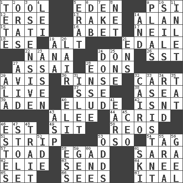 ACROSS 1. Implement 5. Locale of original sin 9. Air pressure measure (abbr.) 12. Celtic language 13. Immoral or dissolute person 14. ____ Jay Lerner 15. Jacques of French films 16. Collude with 17. Famous astronaut Armstrong 18. Compass dir. 19. Keyboard modifier key 21. Peak District village in England 22. Grandmother 24. Spanish title 26. Fast jet (abbr.) 27. Slender Brazilian palm 28. Immeasurably long periods of time 29. Deliberation 30. Wash lightly 32. Haul 36. Moving, as bait 37. Compass dir. 38. At sea 39. Arabian gulf 40. Evade 42. Is not 43. Toward shelter 44. Sour-tasting 46. Eastern Standard Time (abbr.) 49. Be seated 50. Vintage cars 51. Long narrow piece of something 53. Bear (Spanish) 54. Label 57. Frog relative 58. Mild oath 61. "Two Mules for Sister ____" 62. Writer Wiesel 63. Post 64. Leg joint 65. Put into a specified state 66. Observes 67. Slanted text style (abbr.) DOWN 1. False hair 2. Mouths or openings 3. Clearly or manifestly demonstrative 4. Flowery wreath 5. Part of Q.E.F. 6. Small moist lump or mass 7. Make supply last 8. Fish or hair follower 9. Entreaties 10. Travel by water 11. An arm off of a larger body of water 14. Plus 19. Santa ___, CA 20. Den 21. Followers of ems 23. NE Netherlands city 24. Administered medicine 25. Single 27. Enthusiastic 28. Take place subsequently 29. Chicken ___ king 31. Small island 32. Capital of Egypt 33. Helper 34. Tear apart 35. Make lace 40. Connecticut Ivy Leaguer 41. Hearing organs 43. Viper 45. Corporate head (abbr.) 46. _____ Park, CO 47. Took without asking 48. Distinguishing feature 52. Binary compound 53. Likelihood 55. Type of rug 56. Highlander 58. Curvy letter 59. Turn to the right 60. One (Scot) 61. What Jean-Claude Killy likes to do