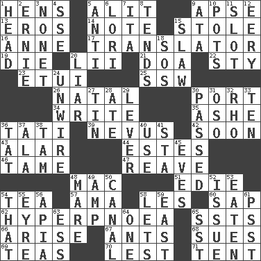 ACROSS 1. Coop moms 5. Came down and settled, as after flight 9. Domed church section 13. Greek god of love 14. Make mention of 15. Took without asking 16. Queen of England 1702-14 17. Interpreter 19. Expire 20. Cards in a Roman deck? 21. ___ good deed 22. Filthy place 23. Needle case 25. Compass dir. 26. Relating to or accompanying birth 30. Left side of a ship or aircraft 34. Compose 35. American tennis player Robert 36. Jacques of French films 39. Congenital growth or mark on the skin 42. Within a short period 43. Having or resembling wings 44. _____ Park, CO 46. Docile 47. Break or tear apart 48. Big _ 51. Singer Brickell 54. Beverage made from leaves 57. Wet nurse (var.) 58. French article 60. Plant excrement 62. Abnormally rapid or deep breathing 65. Fast planes 66. Originate 67. Pismires 68. Institutes legal proceedings 69. Afternoon social gatherings 70. For fear that 71. Portable shelter DOWN 1. Froth on beer 2. Bert's buddy 3. Music written for nine 4. Compass dir. 5. Against 6. Australian parrot (variant) 7. Call ___ day 8. Is inclined (to) 9. _ moment's notice (2 wds.) 10. Plant holders 11. Notch 12. Suggestive of the supernatural 15. Cole _ (cabbage dish) 18. Distress signal 20. One who doesn't tell the truth 24. Undo the wiring of 27. Metal container 28. Had dinner 29. Crowbar 30. Went by 31. Bear (Spanish) 32. 17th letter of the Greek alphabet 33. Nine, plus one 36. Make lace 37. Wing 38. Scottish cap 40. Purpose 41. R.R. building 45. Nights before holidays 48. Female horse 49. Electrical Unit 50. Lessep's creation 52. Come out of 53. Eroded 54. Not this but _ 55. Jane of fiction 56. Capital of Western Samoa 58. Allows 59. 90 degrees 61. Inconspicuous attention getter 63. Curvy letter 64. Single 65. Fast jet (abbr.)
