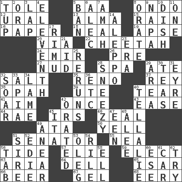 ACROSS 1. Lacquered or enameled metalware 5. Sound made by sheep 8. Southwest Nigerian state 12. Mountain range 13. _ mater 15. Precipitation 16. Some stationery 18. Be tempered by heat 19. Domed church section 20. By way of 22. Leopard's kin 24. Arab leader 26. Before (prefix) 27. Unadorned 28. Health resort 29. Had dinner 32. Table seasoning 35. Former U.S. Attorney General Janet 37. Marina Del _, California 38. Brightly colored fish 39. Shoshoni 40. Pull into pieces 41. Direct toward a target or goal 42. At one time in the past 43. Comfort 44. Actress Charlotte 45. Big collection agency 46. Ardor 49. "One Day ___ Time" 50. Shout 51. Elected representative 55. Teachers' org. 56. Periodic rise and fall of the sea level 57. Writer Wiesel 59. Choose 63. Roberta Peters solo 64. Small valley 65. Austrian river, tributary to the Danube 66. Fermented drink made from hops 67. Set 68. Suggestive of the supernatural DOWN 1. Uncastrated adult male sheep 2. Mouth or opening 3. Infant locale 4. Veterans Day date 5. Prohibit 6. Actor Baldwin 7. Wet nurse 8. Speak pompously 9. California wine valley 10. Food container 11. Single 14. City in Syria 17. Tall New Zealand timber tree 21. Help 23. Epoch 25. Summer TV shows 28. Dwarf with a sinus problem 29. Type of rug 30. Afternoon social gatherings 31. Jane of fiction 32. Fly high 33. Capital of Western Samoa 34. Unable to walk 36. And so on (abbr.) 40. Copy Pinocchio 42. Spoke pompously 45. Call ___ day 47. Car or cant ending 48. Toward shelter 49. Approach 51. Title for a man of rank and authority 52. Singer Brickell 53. Cassini of fashion 54. Cause heat under the collar 56. Keyboard key 58. Pipe bend 60. Compass dir. 61. 4-wheeled motor vehicle 62. Attempt to accomplish something
