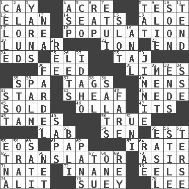 ACROSS 1. Island 4. 43,560 square feet 8. Trial 12. Enthusiasm 14. Theater features 16. _ vera 17. Old wives' tales, e.g. 18. Census information 20. Type of eclipse 22. Electrically charged atom 23. Conclusion 24. Begley and Asner 25. Connecticut Ivy Leaguer 28. _ Mahal 30. Nourish 31. Citrus fruits 35. Health resort 37. Labels 40. Not women's 41. Play the lead 42. Archer's quiver 44. Ancient Persian 45. Exchanged or delivered for money 46. Water jar 47. ___ a Wonderful Life 48. Domesticates 50. Loyal 52. Experiment locale 54. Elected rep. 55. Eastern Standard Time (abbr.) 58. Greek goddess of the dawn 61. Infant food 63. Feeling or showing extreme anger 65. Interpreter 70. SW Saudi Arabia district 71. Nathan's nickname 72. Lacking in sense or substance 73. Snakelike fish 74. Came down and settled, as after flight 75. Chop _ 76. Area sheltered from the wind DOWN 1. Cell (Danish) 2. Verbally 3. Entertaining tales 4. Viper 5. Corporate head (abbr.) 6. Strike 7. Needle holder 8. Make lace 9. Writer Wiesel 10. Within a short period 11. Look after 13. Teachers' org. 15. Narrow, elongated depression 19. Of or related to the anus 21. To riddle 26. Allows 27. Potato state 29. Stevie Ray Vaughan's brother 30. Pack 32. Confront 33. Conclusions 34. Compass dir. 35. Portico 36. Inside of hand 38. Set 39. Table seasonings 41. Fast jet (abbr.) 43. Conductor's collection 49. Plant excrements 51. Single; one (prefix) 53. Indonesian resort city 55. Artist's stand 56. Vertical member of a panel or frame 57. Laconic 58. Inactive volcano in Sicily 59. Spoken 60. Suttee (variant) 62. Baking dishes 64. Actress Charlotte 66. Fish or hair follower 67. The 19th letter of the Greek alphabet 68. Single 69. Marina Del _, California
