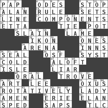 ACROSS 1. Infant food 4. Lyric poems 8. Cease 12. ____ Jay Lerner 14. General guideline 15. Puts into a specified state 16. Actor's bit 17. Parts 20. Singer James 21. Neckwear 22. Cooking vessel 23. Killed 27. Unable to walk 29. Image 31. Singles 34. Sports stadium 35. Taverns 36. Lick closed 39. Order of Saint Francis (abbr.) 41. System (abbr.) 42. Chilled 43. High up in or into the air 46. Capri or Wright 47. One who doesn't tell the truth 48. Spoken 51. Collection of objects 54. Tate display 56. Area sheltered from the wind 58. Amu Darya 61. Rotating or pertaining to rotation 66. Kenny Rogers chart-topper in '80 67. So be it 68. One of the Great Lakes 69. Flair 70. Drove too fast 71. Plant excrements 72. Affectionate concern, for short DOWN 1. Light colored 2. Came down and settled, as after flight 3. Leg coverings 4. The grampus (Milton) 5. Superhero pair 6. Shade tree 7. Back-to-school mo. 8. Compass dir. 9. 3-inch nail 10. Von Bismarck 11. Inconspicuous attention getter 13. Anneal 18. Petroleum 19. Teachers' org. 24. Atmosphere 25. D.D.E's nickname 26. Words to Nanette 28. Damp 30. Relating to the nose 32. Followers of ems 33. Fast jet (abbr.) 34. Tree or shrub in the Birch family 36. _-fi 37. Greek goddess of the dawn 38. One to whom something is allotted 40. Secret move to avoid paying debts 44. Rowing implement 45. Away 49. Keyboard modifier key 50. Flowery wreath 52. Grand slam 53. Honor 54. Caspian sea tributary 55. Play 57. Nights before holidays 59. Allodial 60. Synchronize (abbr.) 62. Plus 63. Epoch 64. Mouth edge 65. It is so