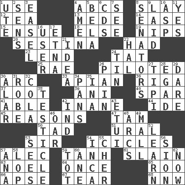 ACROSS 1. Purpose 4. Lettered men learn these first 8. Kill 12. Beverage made from leaves 13. Ancient Persian 14. Relaxation 15. Follow as a consequence or result 18. Otherwise 19. Cuts off 20. French poetic form 22. Possessed 23. Grant temporary use of 24. Make lace 25. Actress Charlotte 26. Manned the helm 30. Curve 33. Bee-related 36. Capital of Latvia 37. Spoils 39. Cuckoo 40. Coast Guard woman 41. Competent 42. Silly 44. Binary compound 45. Thinks logically 47. Scottish cap 50. Bit 51. Mountain range 53. Title for a knight 54. Winter's stalactites 57. Actor Baldwin 59. Hyperbolic tangent 61. Killed 63. Christmas carol 64. At one time in the past 65. Friend of Pooh 66. Domed church section 67. Lacerate 68. Compass dir. DOWN 1. Shoshoni 2. Elected reps. 3. Artist's stand 4. So be it 5. Actor Lugosi 6. Music discs 7. Observe 8. Legislators 9. Put down 10. Cleo's killer 11. Affirmative reply 16. One who uses or employs something 17. Inactive volcano in Sicily 21. The content of cognition 22. Actor Linden 24. Shallow baking pan 26. Ache 27. Native american tent (variation) 28. Mild oath 29. Have the gumption 30. Having or resembling wings 31. Loose flowing garment 32. Root beer relative 34. Zero-star reviews 35. _ tizzy (2 wds.) 38. One of the two male reproductive glands 42. Indiana (abbr.) 43. Needle holder 46. Rowing implement 48. Arches 49. Promenade 52. Acquire or gain knowledge or skills 53. Observes 54. South American Indian 55. "Mermaids" star 56. The Jewish people; Israel 57. Santa ___, CA 58. Chop off 59. Small child 60. One (Scot) 62. Immediately