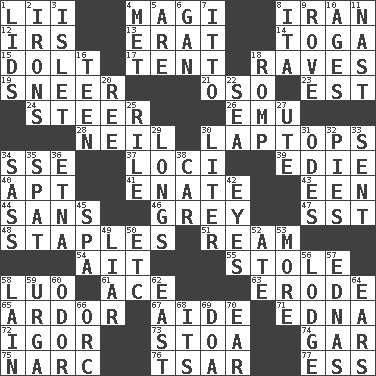 ACROSS 1. Cards in a Roman deck? 4. Wise men 8. SW Asia republic 12. Big collection agency 13. Part of Q.E.F. 14. Ancient Roman robe 15. Stupid person 17. Portable shelter 18. All-night dance parties 19. Contemptuous expression 21. Bear (Spanish) 23. Eastern Standard Time (abbr.) 24. Navigate 26. Australian flightless bird 28. Famous astronaut Armstrong 30. Portable computers 34. Compass dir. 37. Venues 39. Singer Brickell 40. Fitting 41. Maternal 43. Car or cant ending 44. Without 46. Jennifer or Joel 47. Fast jet (abbr.) 48. Paper fasteners 51. 480, 500 or 516 sheets of paper 54. Small island 55. Took without asking 58. Nilotic language 61. Adept person 63. Wear away 65. Zeal 67. Helper 71. Pulitzer Prize-winning author Ferber 72. Russian composer Stravinsky 73. Portico 74. Slender fish 75. Drug cop 76. Russian ruler of old 77. Double-curved letter DOWN 1. Flaplike coverings 2. Removes the wrinkles 3. Small island 4. Was introduced to 5. "We ___ not amused" (Victoria) 6. Separate the seeds from cotton 7. "Tell ____ the Marines!" 8. Call ___ day 9. Be footloose 10. Matures 11. Political cartoonist Thomas 16. Adolescent 18. Frolic 20. To separate or throw off 22. Ocean 25. Cause heat under the collar 27. Shoshoni 29. Yearns 30. 61 cubic inches 31. Lyric poems 32. Sliced desserts 33. Emitted 34. Backtalk 35. Petty quarrel 36. Inactive volcano in Sicily 38. 4-wheeled motor vehicle 42. Snake ____ (dice throw) 45. Health resort 49. One who doesn't tell the truth 50. And so on (abbr.) 52. Had dinner 53. Greater amount 56. Cabin 57. Ferber et al. 58. (Had) reclined 59. Capital and largest city of Mongolia 60. Aroma 62. 90 degrees 64. Hearing organs 66. The grampus (Milton) 68. ___ a Wonderful Life 69. ___ good deed 70. Ewer handle