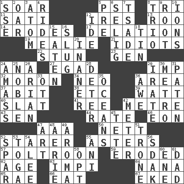 ACROSS 1. Fly high 5. Pacific Standard Time (abbr.) 8. Three (prefix) 11. Suttee (variant) 12. Angers 13. Friend of Pooh 14. Eats (away) 17. Accusation by an informer 19. Ear of corn 21. Foolish or stupid persons 22. Surprise greatly 23. Commissioned military rank (abbr.) 24. Santa ___, CA 27. Mild oath 29. Mischievous child 32. Person of subnormal intelligence 34. Modern: prefix 36. Type of rug 37. "This won't hurt ____!" 38. And so on (abbr.) 39. Electrical Unit 40. Narrow board 41. To separate or throw off 42. Distance measurement (Brit.) 43. Elected rep. 44. Pace 46. Age 47. American Automobile Association (abbr.) 50. Remaining after all deductions 52. A viewer who gazes fixedly 55. Michaelmas daisies 57. Characterized by complete cowardliness 59. Eaten away 62. Mature 63. Body of Kaffir warriors 64. Nanny 65. Actress Charlotte 66. Erode 67. Made supply last DOWN 1. Compass dir. 2. Boat paddle 3. Tiny particle 4. Amusement-park features 5. Before (prefix) 6. Major League Baseball Commissioner Bud 7. Sadhe (variant) 8. Musical group of three 9. Carrot, for example 10. Charged atoms 12. Binary compound 15. Ingested 16. Snaillike creature with no shell 18. Metal container 20. More lacking in sense or substance 24. Collect or gather 25. Having high moral qualities 26. Believer in; advocate of (suffix) 28. Prevent from occurring 29. Feeling or showing extreme anger 30. Paris' subway 31. Eucharist need 33. Baseball player Mel 35. Seas 36. Deep reverence 42. Distance measurement 45. False hair 47. Tate display 48. Nest on high 49. Odor 51. Heavy duty weighing machine 52. Practice fight 53. Ancient Roman robe 54. Toward shelter 55. Black tropical American cuckoo 56. Neighbor of Neb. 58. Elect 60. Compass dir. 61. Male parent