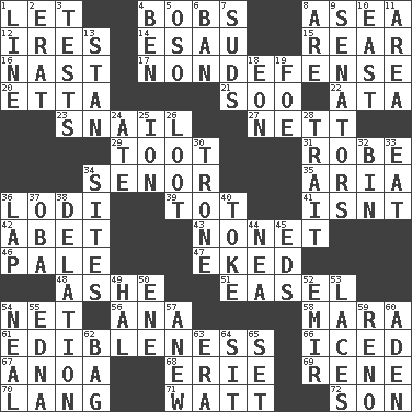 ACROSS 1. Allow 4. Moves up and down 8. At sea 12. Angers 14. He sold his birthright 15. Tail end 16. Political cartoonist Thomas 17. Unrelated to defense, as in spending 20. Singer James 21. "Barney Miller" actor Jack 22. _ moment's notice (2 wds.) 23. Slow-paced one 27. Remaining after all deductions 29. A blast of a horn 31. Loose flowing garment 34. Sir (Sp.) 35. Roberta Peters solo 36. Farming town in central California 39. Small child 41. Is not 42. Collude with 43. Music written for nine 46. Light colored 47. Made supply last 48. American tennis player Robert 51. Artist's stand 54. Fish or hair follower 56. Santa ___, CA 58. Hindu Mythology: god of death 61. The property of being fit to eat 66. On the rocks 67. Small Philippine buffalo 68. One of the Great Lakes 69. French philosopher Descartes 70. Long (Scottish) 71. Electrical Unit 72. Boy, to dad DOWN 1. Actor's bit 2. Part of Q.E.F. 3. Trials 4. Benjamin's nick name 5. Bear (Spanish) 6. Forbid 7. Beer foam 8. "We ___ not amused" (Victoria) 9. Legislators 10. Compass direction 11. Type of rug 13. Comedian Laurel of Laurel & Hardy 18. A really long time 19. Enemy 24. Had dinner 25. Electrically charged atom 26. Plunder 28. Distinguishing feature 30. Marketplace scale 32. Storage container 33. Consume 34. Settings 36. Infant locale 37. Chief or king in Benin or Nigeria 38. Conveyance 40. Casino tip 44. Teachers' org. 45. Begley and Asner 49. Actor Linden 50. Compass dir. 52. Independent ruler or chieftain 53. Shoestrings 54. Anneal 55. Pulitzer Prize-winning author Ferber 57. Afresh 59. Former U.S. Attorney General Janet 60. Arabian gulf 62. Container for groceries 63. Period 64. Be seated 65. Put into a specified state