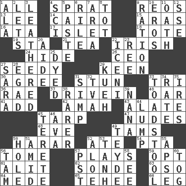 ACROSS 1. 100% 4. Small fatty European fish 9. Vintage cars 13. Area sheltered from the wind 14. Capital of Egypt 15. Caspian sea tributary 16. "One Day ___ Time" 17. Small island 18. Carry 19. R.R. building 21. Afternoon social gathering 22. From or relating to Ireland 24. Flintstone garb 26. Corporate head (abbr.) 27. Morally degraded 29. Peachy ____! 30. Match 31. Surprise greatly 33. Three (prefix) 36. Actress Charlotte 37. Popular '50s hangout 40. Rowing implement 41. Increase 42. Nanny 43. Having winglike extensions 45. Canvas cover 47. Unclothed pictures 48. First lady 49. Scottish caps 50. Ethiopian city, capital of Harari 52. Had dinner 54. Parent Teacher Association (abbr.) 56. Heavy book 57. Frolics 59. Choose 61. Set down 62. Message 63. Bear (Spanish) 64. Ancient Persian 65. Giggle 66. Part of a journey DOWN 1. In the manner of 2. Allows 3. Tough but pliablecoriaceous 4. _-fi 5. Thick mixture 6. Cause heat under the collar 7. Type of rug 8. Small child 9. Food allowance for one day 10. Greek god of love 11. Pledge 12. Compass dir. 20. Assistant 22. Ancient Celtic tribe of eastern Britain 23. To sift 25. Colored 27. "Two Mules for Sister ____" 28. Mild oath 29. Malaysian steamed pastry 31. Simple or foolish person 32. Federal power corp. 33. Inedible or poisonous agaric 34. Assign a rank or rating to 35. Angers 38. More valued for its uncommonness 39. Nanny 44. Mass 45. Cylindrical with tapered ends 46. Actress Gardner 49. Miss Universe 1986, Barbara Palacios _ 50. Opening into or through something 51. Among 52. Medicinal plant 53. Hyperbolic tangent 55. Domed church section 56. Scottish cap 57. Pacific Standard Time (abbr.) 58. Observe 60. Coat; cloak