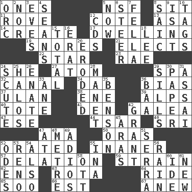 ACROSS 1. Singles 5. Overdraft (abbr.) 8. Be seated 11. Be footloose 12. ____ d'Azur (French Riviera) 13. White ___ sheet 14. Cause to be 17. Home 19. Sounds asleep 21. Opts 22. Play the lead 23. Actress Charlotte 24. A female animal or person 27. Smallest unit of an element 29. Health resort 32. Lessep's creation 34. Small moist lump or mass 36. Prejudice 37. Uhlan (variant) 38. Compass dir. 39. High mountains 40. Haul 41. Lair 42. An organ shaped like a helmet 43. Compass dir. 44. Russian ruler of old 46. Indian title of respect (Mr.) 47. Nanny (var.) 50. Mouths or openings 52. Declaimed 55. More empty; more void 57. Conveyance 59. Put through a sieve 62. Followers of ems 63. Round or rotation of duties 64. Travel on an animal 65. "Barney Miller" actor Jack 66. Eastern Standard Time (abbr.) 67. Afresh DOWN 1. The grampus (Milton) 2. Or not 3. Nights before holidays 4. Seines 5. Immediately 6. Bull 7. Man or boy (slang) 8. Ketch in the Levant 9. Is not 10. Labels 12. Music discs 15. "_____ Recall" 16. Part of Q.E.F. 18. Area sheltered from the wind 20. Worn away 24. Turtle shell scale 25. Radiant circles of light 26. Maternal 28. French painter Edouard 29. Beverly of Met fame 30. Some stationery 31. Slender Brazilian palm 33. One (Scot) 35. Gillaume's butler role 36. Sound made by sheep 42. Let have 45. Caspian sea tributary 47. "One Day ___ Time" 48. Distance measurement (Brit.) 49. Goodbye (Sp.) 51. Spanish missionary in California 52. Lyric poems 53. Western Nevada city 54. In addition 55. _ tizzy (2 wds.) 56. Precipitation 58. Baseball player Mel 60. Binary compound 61. ___ Haven, CT