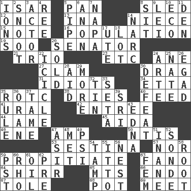 ACROSS 1. Austrian river, tributary to the Danube 5. Baking dish 8. Downhill vehicle 12. Single time 13. _ tizzy (2 wds.) 14. Sibling's daughter 15. Make mention of 16. Census information 19. "Barney Miller" actor Jack 20. Elected representative 21. Musical group of three 23. And so on (abbr.) 24. One (Scot) 27. Burrowing marine mollusk 30. To trail on the ground 31. Foolish or stupid persons 34. Singer James 35. College mil. group 38. Frees from moisture 40. Nourish 41. Mountain range 42. Main course 44. Unable to walk 45. Opera by Verdi 46. Compass dir. 47. Electrical Unit 50. Nuclear Threat Initiatives 53. French poetic form 57. Or not 59. Appease 63. Papal veil 64. Bake eggs in their shells 65. Mountains (abbr.) 66. Inside; within (prefix) 67. Lacquered or enameled metalware 68. Cooking vessel 69. Confront DOWN 1. Charged atoms 2. Snout, nose 3. Thespian 4. To separate or throw off 5. Corncob 6. At once, immediately (arch.) 7. California wine valley 8. Be seated 9. Flowery wreath 10. Environmental prefix 11. Lair 14. Drug cop 17. Shoshoni 18. Car dealer's back yard 20. Exchanged or delivered for money 22. Tapering mass of hanging ice 24. Johnson of "Laugh-In" 25. Nathan's nickname 26. Mild oath 28. Help 29. Greater amount 30. Outscore 32. Shallow baking pan 33. Bristle 35. Court order 36. Northwest Algerian city 37. Docile 39. _ Lanka 43. Pulitzer Prize-winning author Ferber 47. SW Saudi Arabia district 48. Was introduced to 49. 23rd letter of the Greek alphabet 51. Empty; void 52. Something which is sent 54. Pack (down) 55. "Tell ____ the Marines!" 56. Egg locale 58. Carrot, for example 59. Pacific Standard Time (abbr.) 60. 17th letter of the Greek alphabet 61. Petroleum 62. Before (prefix) 63. Opposite of masc.