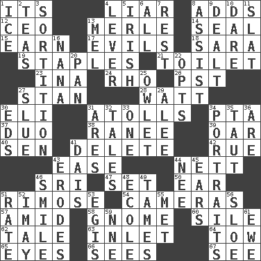 ACROSS 1. It is 4. One who doesn't tell the truth 8. Sums up 12. Corporate head (abbr.) 13. Haggard of country music 14. Lick closed 15. Merit 17. Vices 18. "Two Mules for Sister ____" 19. Paper fasteners 21. Bathroom plumbing fixture 23. _ tizzy (2 wds.) 24. 17th letter of the Greek alphabet 26. Pacific Standard Time (abbr.) 27. Comedian Laurel of Laurel & Hardy 28. Electrical Unit 30. Biblical high priest 31. Ringlike coral islands and reefs 34. Parent Teacher Association (abbr.) 37. Superhero pair 38. Indian princess (variant) 39. Rowing implement 40. Elected rep. 41. Erase 42. Regret 43. Comfort 44. Remaining after all deductions 46. _ Lanka 47. Arrange properly for use 50. Hearing organ 51. Full of chinks, cracks, or crevices 54. Devices for capturing images 57. Among 58. Dwarf 60. Filth; sediment 62. Lie 63. An arm off of a larger body of water 64. Pull behind 65. Sight organs 66. Perceives with the eye 67. Observe DOWN 1. Frozen water 2. Beverages made from leaves 3. Casting lots 4. Crowbar 5. From or relating to Ireland 6. 100% 7. Remainder 8. Aid 9. Started a card game 10. Have the gumption 11. Narrow board 13. Cartoonist voice _ Blanc 16. Grandmother 20. Baking dish 22. Chooses 25. A small or young owl 27. Change direction abruptly 29. Toward shelter 30. Begley and Asner 31. Ancient Greek god of war 32. Stories 33. Single 34. Likenesses of persons 35. Tense 36. "We ___ not amused" (Victoria) 41. Raised platform 43. Eats (away) 44. Born 45. Hearing organs 46. Grin 48. Learning spot: Fr. 49. Corrects by punishment or discipline 51. Assign a rank or rating to 52. "If ____ say so..." 53. Armor plate that protects the chest 55. Was introduced to 56. A type of plum 59. Compass dir. 61. She-sheep