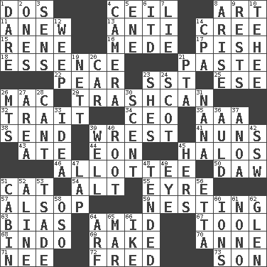 ACROSS 1. Two (Sp.) 4. To provide with a ceiling 8. Tate display 11. Afresh 13. Opposed to 14. Algonquian 15. French philosopher Descartes 16. Ancient Persian 17. Expression of disdain 18. Substance 21. Thick mixture 22. Lightbulb-shaped fruit 23. Fast jet (abbr.) 25. Compass dir. 26. Apple computer (short form) 29. File 13 32. Distinguishing feature 34. Corporate head (abbr.) 35. Auto club (abbr.) 38. Post 39. Take or capture by force 41. Religious women 43. Had dinner 44. Period of immesurable duration 45. Auras 46. One to whom something is allotted 50. Fool 51. Domesticated feline 54. The first octave above the treble staff 55. Jane of fiction 57. Columnist Joseph or Stewart 59. Snuggling 63. Prejudice 64. Among 67. Utensil 68. Southeast Asian peninsula 69. Immoral or dissolute person 70. Queen of England 1702-14 71. Born 72. Flintstone 73. Manchild DOWN 1. Have the gumption 2. Singles 3. Elected reps. 4. Device for capturing images 5. Compass dir. 6. It would 7. Untruth 8. Originate 9. Musical pauses 10. Giggle 12. Shed a tear 14. Accounting whiz (abbr.) 19. Remaining after all deductions 20. Automobile 21. Parent Teacher Association (abbr.) 23. "______ My Girl" (Turtles hit) 24. Highlander 26. Mountains (abbr.) 27. Length times width 28. Patter 30. Aroma 31. Grandmother 33. The content of cognition 36. Old (Scot.) 37. Small Philippine buffalo 39. Not ill 40. Carrot, for example 42. Compass dir. 45. Possessive pronoun 47. Pet locale 48. Watched over 49. Sight organ 51. Apartment or room in a ship 52. Place in a line 53. Sadhe (variant) 56. Singer James 58. Bear (Spanish) 60. Charged particles 61. Words to Nanette 62. Small, secluded valley 64. Sandy's bark 65. Third mo. 66. Eisenhower's nickname