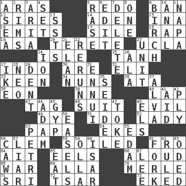 ACROSS 1. Ancient river in northeast Turkey 5. Do over again 9. Forbid 12. Fathers 14. An important port of Yemen 15. _ tizzy (2 wds.) 16. Sends forth 17. Filth; sediment 18. Reproach for some lapse or misdeed 19. White ___ sheet 20. Cigar-shaped 23. Southern CA. univ. 24. Small island 25. Hyperbolic tangent 27. Southeast Asian peninsula 30. "We ___ not amused" (Victoria) 32. Connecticut Ivy Leaguer 33. Peachy ____! 34. Religious women 36. _ moment's notice (2 wds.) 38. Age 39. Compass dir. 40. Infant locale 43. Label 46. Set of matching outer garments 48. Morally bad or wrong 49. Color 51. Wedding promise 52. Kenny Rogers chart-topper in '80 53. Dad 54. Supplements with great effort 56. To starve (Brit.) 58. Dirtied 61. From 64. Small island 65. Snakelike fish 66. Verbally 68. Armed conflict 69. Silent film actress Nazimova 70. Haggard of country music 71. Indian title of respect (Mr.) 72. Russian ruler of old 73. Made supply last DOWN 1. Toward the sea 2. Basketball hoops 3. Operatic vocal solo 4. Put into a specified state 5. To erase 6. Prepare for publication 7. Keyboard key 8. Single 9. A tree used for making furniture 10. Of or related to the anus 11. California wine valley 13. Fast planes 21. Flair 22. Summer TV shows 23. A single undivided whole 24. Electrically charged atom 26. Chicken ___ king 27. Eisenhower's nickname 28. Modern: prefix 29. Gouge 31. World-weariness 35. A glass for beer 37. Inventor's middle name 41. Assist 42. Strand of rope, yarn or thread 44. First of billions? 45. Hustle 47. Casino tip 48. Raised railways 50. Artist's stands 53. _ dish (used to culture cells) 55. Dutch treat 56. Crow sounds 57. One who doesn't tell the truth 59. Water jar 60. Austrian river, tributary to the Danube 61. Tined utensil 62. General guideline 63. Wrote a lyric poem 65. Ingest 67. Area sheltered from the wind