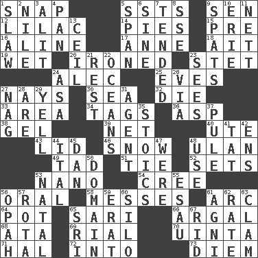 ACROSS 1. Fastener 5. Fast planes 9. Elected rep. 12. Pale purple color 14. Sliced desserts 15. Before (prefix) 16. Place in a line 17. Singer Murray 18. Small island 19. Soggy 20. Pressed 23. Proofreading order 24. Actor Baldwin 25. Nights before holidays 27. Negative votes 30. Ocean 32. Pass on 33. Length times width 34. Labels 36. Viper 38. Set 39. Fish or hair follower 40. Shoshoni 43. Hat (slang) 46. Overwhelm 48. ____ Bator, Mongolia 49. Small boy 51. Make a knot 52. Arranges properly for use 53. Billionth: prefix 54. Algonquian 56. Relating to the mouth 58. Makes clutter 61. Curve 64. Cooking vessel 65. Indian skirt 66. Therefore, facetiously 68. _ moment's notice (2 wds.) 69. Monetary unit of Yemen 70. National forest in Provo, Utah 71. Actor Linden 72. To the inside or interior of 73. South Vietnam president (1954) DOWN 1. Cole _ (cabbage dish) 2. Mediterranean tributary 3. Set down 4. Baking dish 5. Connect, as a bridge 6. Trig term 7. Looked after 8. Compass dir. 9. Arguments over trivial matters 10. 4th largest of the Great Lakes 11. Remaining after all deductions 13. To provide with a ceiling 21. Relief 22. Seas 23. Observes 24. White ___ sheet 26. By way of 27. Tired old horse 28. "We ___ not amused" (Victoria) 29. Shout 31. Representative 35. Unemotional ones 37. Whimper 41. Make lace 42. Followers of ems 44. Slanted text style (abbr.) 45. One of the 12 tribes of Israel 47. We are 48. Purpose 50. Kingdom 53. Brizilian seaport 55. Son of Isaac 56. Brightly colored fish 57. Roll call or roster of names 59. Part of Q.E.F. 60. Grain storage tower 61. Hindu god of fire 62. Pace 63. Burrowing marine mollusk 65. _ Lanka 67. To free from