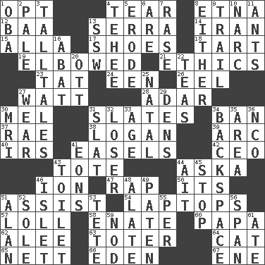 ACROSS 1. Choose 4. Separate forcefully 8. Inactive volcano in Sicily 12. Sound made by sheep 13. Father Junipero _ 14. SW Asia republic 15. Silent film actress Nazimova 17. Imelda's hoard 18. Small pie 19. Turned at an angle; bent 21. Moral principles 23. Make lace 24. Car or cant ending 26. Snakelike fish 27. Electrical Unit 28. The sixth month of the Jewish calendar 30. Cartoonist voice _ Blanc 31. Chalkboards 34. Prohibit 37. Actress Charlotte 38. Utah city north of Ogden 39. Curve 40. Big collection agency 41. Artist's stands 42. Corporate head (abbr.) 43. Carryall 44. "____ silly question..." 46. Electrically charged atom 47. Reproach for some lapse or misdeed 50. It is 51. Aid 54. Portable computers 57. Hang loosely or laxly 58. Related on the mother's side 60. Dad 62. Toward shelter 63. Carrier 64. Feline 65. Remaining after all deductions 66. Genesis locale 67. Compass dir. DOWN 1. Chief or king in Benin or Nigeria 2. Diluted with white 3. Baron Munchausen's specialties 4. Giggle 5. Wear away 6. "We ___ not amused" (Victoria) 7. Raze (variant) 8. One or the other 9. Hang back 10. Drug cop 11. Pismires 13. Compass dir. 16. Blind as ____ 20. Baseball player Mel 22. Beverages made from leaves 25. Brizilian seaport 27. Erode 29. Hiding places for outlaws 30. Medical imaging device (abbr.) 31. Narrow board 32. Failure 33. Mature 34. Keyboard key 35. Type of rug 36. Non-commissioned officer (abbr.) 41. Immeasurably long periods of time 43. Rest room 44. Small island 45. Constrict 46. Small island 48. Having winglike extensions 49. Eucharist need 51. Actor Alda or Thicke 52. Not divided or shared with others 53. False hair 55. For each 56. Connect, as a bridge 59. Lower and raise head in agreement 61. Had dinner