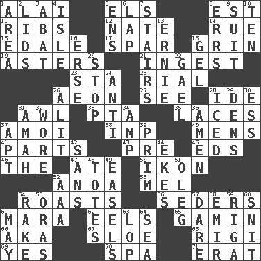ACROSS 1. Jai ____ 5. Raised railways 8. Eastern Standard Time (abbr.) 11. Teases 12. Nathan's nickname 14. Sorrow 15. Peak District village in England 17. Practice fight 18. Amused look 19. Michaelmas daisies 21. Consume 23. R.R. building 25. Monetary unit of Yemen 26. Period of immesurable duration 27. Observe 28. Binary compound 31. Leather borer 33. Parent Teacher Association (abbr.) 35. Shoestrings 37. Mine, in Marseilles 38. Naughty child 40. Not women's 41. Components 43. Before (prefix) 45. Begley and Asner 46. Definite Article 47. Had dinner 50. Visual representation of an object 52. Small Philippine buffalo 53. Cartoonist voice _ Blanc 54. Exposes to great heat 56. Spring feasts 61. Hindu Mythology: god of death 62. Snakelike fish 65. Homeless child 66. Alias (abbr.) 67. A type of plum 68. Swiss mountan, "Queen of the Mountains" 69. It is so 70. Health resort 71. Part of Q.E.F. DOWN 1. Type of rug 2. Hats (slang) 3. Blind as ____ 4. Capri or Wright 5. Followers of ems 6. Pet locale 7. Flight of steps 8. Blunders 9. Set or collection 10. "___ Little Indians" 13. Bert's buddy 16. Celtic language 18. Set 20. Halt 22. Highlander 24. Against 26. Came down and settled, as after flight 28. On the rocks 29. Hiding places for outlaws 30. Curvy letter 31. Nanny 32. Had on 34. Electrical Unit 36. So be it 37. Fitting 39. Demure 42. Without 44. Makes supply last 48. Hauls 49. Artist's stands 51. Cassini of fashion 52. American Automobile Association (abbr.) 54. Libertine 55. Mouths or openings 57. Have the gumption 58. Arab leader 59. Capital of Latvia 60. In a ____ (agitated or irritated) 61. Can I? 63. Chop off 64. Ocean