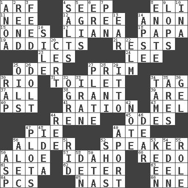 ACROSS 1. Sandy's bark 4. Ooze 8. Biblical high priest 11. Born 12. Match 14. At once, immediately (arch.) 15. Singles 17. Climbing, woody, usually tropical vines 18. Dad 19. Inveterate users 21. Musical pauses 23. French article 24. Area sheltered from the wind 25. Baltic tributary 27. Demure 30. _ de Janeiro 31. Bathroom plumbing fixture 34. Label 37. 100% 38. Monetary aid 39. "We ___ not amused" (Victoria) 40. Pacific Standard Time (abbr.) 41. Food allowance for one day 43. Cartoonist voice _ Blanc 44. French philosopher Descartes 45. Lyric poems 47. Sliced dessert 49. Had dinner 50. Tree or shrub in the Birch family 52. Orator 56. Medicinal plant 57. Potato state 60. Make new 61. Stalk of a moss capsule 62. Prevent from occurring 63. Snakelike fish 64. Personal Computers (abbr.) 65. Political cartoonist Thomas 66. Compass dir. DOWN 1. Small Philippine buffalo 2. Tear apart 3. Nourish 4. Table seasonings 5. Armor plate that protects the chest 6. Epoch 7. Animal enclosure 8. Related on the mother's side 9. Chops off 10. _ tizzy (2 wds.) 13. Hearing organ 14. Domed church section 16. Filth; sediment 20. An absolute certainty 22. Shade tree 25. Petroleums 26. Dunce 27. Food holder 28. Painter Guido (1575-1642) 29. "Tell ____ the Marines!" 30. Strike 32. Legendary monster 33. SW Asia republic 34. Docile 35. Ancient Greek god of war 36. Set 42. Short letter 44. To riddle 46. Letter starter 47. Secret plans 48. The content of cognition 49. To the left, to Queeg 50. Actor Baldwin 51. To free from 52. "______ My Girl" (Turtles hit) 53. Peachy ____! 54. Locale of original sin 55. Hero or heavy, e.g. 56. Viper 58. Lair 59. _ moment's notice (2 wds.)