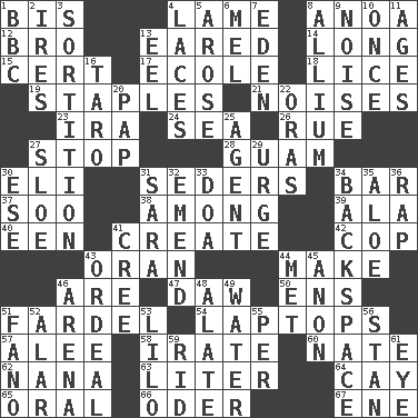 ACROSS 1. Altar cloth linen 4. Unable to walk 8. Small Philippine buffalo 12. Sis' sibling 13. Having ears or earlike features 14. Having great length 15. Sure thing 17. Learning spot: Fr. 18. Louse (plural) 19. Paper fasteners 21. Annoying sounds 23. Retirement account (abbr.) 24. Ocean 26. Sorrow 27. Discontinue 28. Island territory of the United States 30. Biblical high priest 31. Spring feasts 34. Soap unit 37. "Barney Miller" actor Jack 38. Amid 39. According to 40. Car or cant ending 41. Make 42. Police officer (slang) 43. Northwest Algerian city 44. Cause to be 46. "We ___ not amused" (Victoria) 47. Fool 50. Followers of ems 51. Burden 54. Portable computers 57. Toward shelter 58. Feeling or showing extreme anger 60. Nathan's nickname 62. Grandmother 63. 61 cubic inches 64. Island 65. Spoken 66. Baltic tributary 67. Compass dir. DOWN 1. English channel? 2. Angers 3. Casting lots 4. Shoestrings 5. Came up 6. Cartoonist voice _ Blanc 7. Paradise 8. Plant genus of onion and garlic 9. Annoying sound 10. At one time in the past 11. Matures 13. Snakelike fish 16. Edible starchy tuberous root 20. Infant food 22. Mouths or openings 25. Representative 27. A type of plum 29. Goad 30. Compass dir. 31. "Two Mules for Sister ____" 32. Make improvements or corrections to 33. ___ good deed 34. Keyboard key 35. _ vera 36. Hit sharply and swiftly 41. Algonquian 43. Severe or trying experience 44. Was introduced to 45. Soon (poet.) 46. Sports stadium 48. Having winglike extensions 49. Wetness 51. Papal veil 52. Having or resembling wings 53. _ and Stitch 55. For each 56. Comedian Laurel of Laurel & Hardy 59. To free from 61. Sight organ