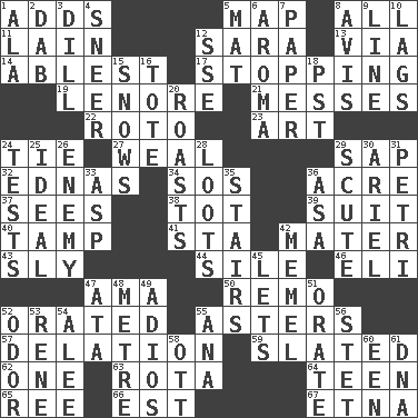 ACROSS 1. Sums up 5. Atlas unit 8. Everything 11. (Had) reclined 12. "Two Mules for Sister ____" 13. By way of 14. Most capable 17. Ceasing 19. Poe poem 21. Makes clutter 22. Printing process, for short 23. Nonscientific branch of learning 24. Make a knot 27. Welt 29. Plant excrement 32. Ferber et al. 34. Mayday 36. Measure of real estate 37. Perceives with the eye 38. Small child 39. Set of matching outer garments 40. Pack (down) 41. R.R. building 42. Mother 43. Cunning 44. Filth; sediment 46. Biblical high priest 47. Nursemaid (var.) 50. San ____ (Riviera town) 52. Declaimed 55. Michaelmas daisies 57. Accusation by an informer 59. Scheduled 62. Single 63. Round or rotation of duties 64. Adolescent 65. Portuguese money of account (variant) 66. Eastern Standard Time (abbr.) 67. Inactive volcano in Sicily DOWN 1. In the manner of 2. Small moist lump or mass 3. Deli pickle 4. Contemptuous expression 5. Floor covering 6. Odor 7. Some stationery 8. Opinion 9. Actor's bit 10. Straggles 12. Compass dir. 15. Overwhelms 16. Carryall 18. Pacific Standard Time (abbr.) 20. Ridicules or criticizes harshly 24. Trials 25. Perfect 26. Foe 28. Plunders 29. Snake scale 30. Satellite of Uranus 31. _ dish (used to culture cells) 33. Viper 35. Flight of steps 36. White ___ sheet 42. Klaipeda city 45. Allows 47. "One Day ___ Time" 48. Distance measurement (Brit.) 49. Goodbye (Sp.) 51. Speak pompously 52. Aroma 53. French philosopher Descartes 54. Toward shelter 55. Santa ___, CA 56. Proofreading order 58. Baseball player Mel 60. Car or cant ending 61. Heredity factor (abbr.)