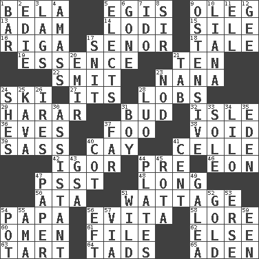 ACROSS 1. Actor Lugosi 5. The front part of a cuirass 9. Cassini of fashion 13. First of billions? 14. Farming town in central California 15. Drop; flow; fall 16. Capital of Latvia 17. Sir (Sp.) 18. Falsehood 19. Core 21. "___ Little Indians" 22. Stricken, poetically 23. Nanny 24. What Jean-Claude Killy likes to do 27. It is 28. Tennis shots 29. Ethiopian city, capital of Harari 31. Partially opened flower 32. Capri or Wright 36. Nights before holidays 37. Egg _ yung 38. State of nonexistence 39. Backtalk 40. Island 41. Cell (Danish) 42. Composer Stravinsky 44. Before (prefix) 46. Age 47. Inconspicuous attention getter 48. Protracted 50. _ moment's notice (2 wds.) 51. Electrical Measurement 54. Dad 56. Webber/Rice musical 58. Old wives' tales, e.g. 60. Presage 61. Do some clerical work 62. Otherwise 63. Small pie 64. Small amounts or degrees 65. An important port of Yemen DOWN 1. Soap unit 2. Singer Brickell 3. Falls behind 4. Collect or gather 5. Opts 6. Went 7. Wedding promise 8. Title for a knight 9. Clearly or manifestly demonstrative 10. Woody, climbing, usually tropical plant 11. Pipe bend 12. Turn to the right 17. In a ____ (agitated or irritated) 20. Independent ruler or chieftain 21. Bar bill 23. Allow head to fall sleepily 24. "______ My Girl" (Turtles hit) 25. Polynesian shrub of the pepper family 26. Angers 28. Nilotic language 30. Helper 31. Male child 33. Flatfish 34. _ and Stitch 35. Paradise 37. Distant 40. Small bed 41. Penny 43. Girls' org. (abbr.) 44. Food holders 45. Round or rotation of duties 47. Some stationery 49. An organ shaped like a helmet 51. Rampant 52. Gilded 53. Celtic language 54. Plant holder 55. Housemaid (var.) 56. Bank Draft (abbr.) 57. By way of 59. Car or cant ending