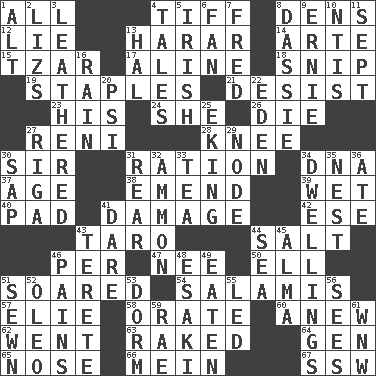 ACROSS 1. Everything 4. Small quarrel 8. Lairs 12. Falsehood 13. Ethiopian city, capital of Harari 14. Johnson of "Laugh-In" 15. Russian ruler 17. Place in a line 18. Clip 19. Paper fasteners 21. Stop 23. Part of HMS, perhaps 24. A female animal or person 26. Expire 27. Painter Guido (1575-1642) 28. Leg joint 30. Title for a knight 31. Food allowance for one day 34. Heredity factor (abbr.) 37. Grow older 38. Make improvements or corrections to 39. Soggy 40. Writing tablet 41. Break 42. Compass dir. 43. Pacific island yam 44. Table seasoning 46. For each 47. Born 50. Pipe bend 51. Flew 54. Deli grouping 57. Writer Wiesel 58. Declaim 60. Afresh 62. Gone 63. Moved through 64. Commissioned mil. rank 65. Olfactory organ 66. Chow _ 67. Compass dir. DOWN 1. The first octave above the treble staff 2. Belonging to Elizabeth 3. Tough but pliablecoriaceous 4. Stories 5. From or relating to Ireland 6. Air blower 7. Flintstone 8. Small ungulate mammals of Africa 9. Bert's buddy 10. Nuclear Threat Initiatives 11. Back-to-school mo. 13. Actor Linden 16. Precipitation 20. 23rd letter of the Greek alphabet 22. Locale of original sin 25. Supplementing with great effort 27. Capital of Latvia 29. Thickened enlargement 30. Plant excrement 31. Posterior 32. ID or VA city 33. Beverage made from leaves 34. Homes 35. Egg locale 36. Had dinner 41. Have the gumption 43. Cylindrical with tapered ends 44. Ocean 45. _ mater 46. Aches 48. 1973 Nobel Price Winner (Physics) Leo 49. Ingested 51. Stitched 52. Butter sub 53. Dormintory (informal) 55. Directed 56. Perceives with the eye 59. Actress Charlotte 61. Compass dir.